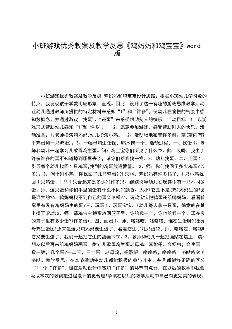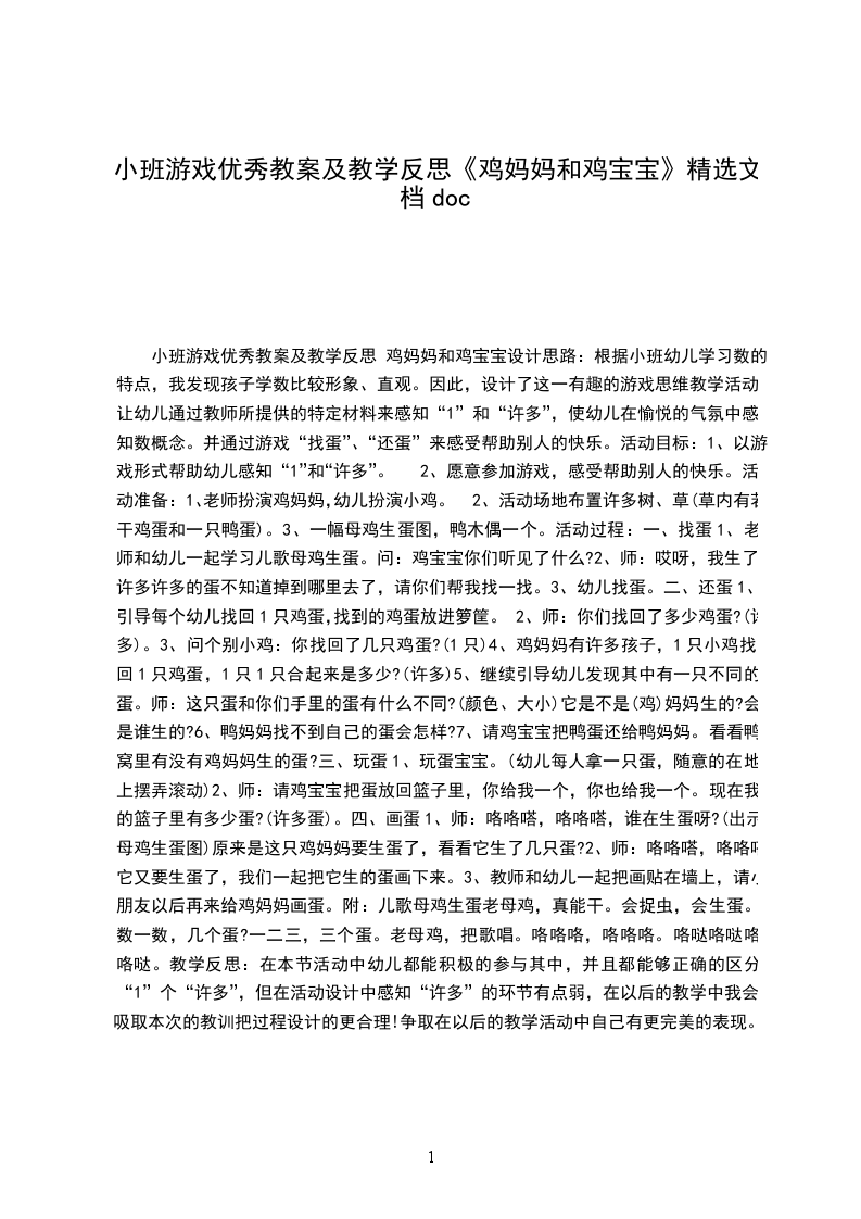 三、结束部分:教师以鸡妈妈口吻感谢:“谢谢你们帮我捉到这么多的小虫子!鸡宝宝们好高兴啊!我们一起去外面喂鸡宝宝吃虫子吧!”带领幼儿离开活动室。活动反思:鸡妈妈和它的宝宝们是一个充满温馨的亲情故事,活动中通过鸡妈妈丢蛋、找蛋、孵蛋等情节,设计了帮鸡妈妈找蛋、抱鸡妈妈出来、帮小鸡找虫吃等游戏环节,让幼儿随着故事情节的推进,在游戏情境中学习表达表现出对鸡妈妈和宝宝们的安慰、关心和帮助,教师以亲切的声音讲述了鸡妈妈对宝宝们的关爱。同时也考虑到了小班幼儿的年龄特点,以情景教学为主,自制了可操作互动的立体图画书,深深的吸引了孩子和听课老师们的目光;还布置了具有强烈温馨感的活动场景,使温馨的亲子情感在活动的体验中得以进一步烘托。整个课堂还是比较温馨、生动、有趣。不足之处: