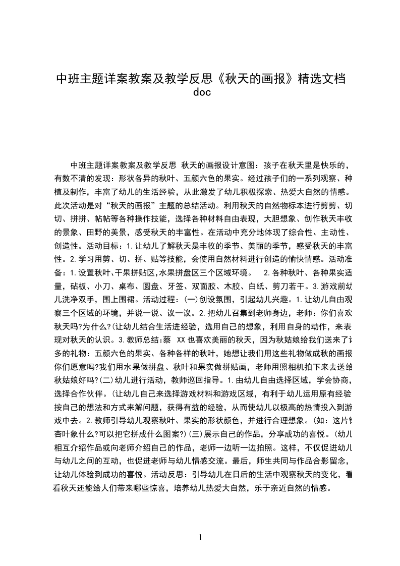中班主题详案教案及教学反思 秋天的画报设计意图:孩子在秋天里是快乐的,有数不清的发现:形状各异的秋叶、五颜六色的果实。经过孩子们的一系列观察、种植及制作,丰富了幼儿的生活经验,从此激发了幼儿积极探索、热爱大自然的情感。此次活动是对“秋天的画报”主题的总结活动。利用秋天的自然物标本进行剪剪、切切、拼拼、帖帖等各种操作技能,选择各种材料自由表现,大胆想象、创作秋天丰收的景象、田野的美景,感受秋天的丰富性。在活动中充分地体现了综合性、主动性、创造性。活动目标: