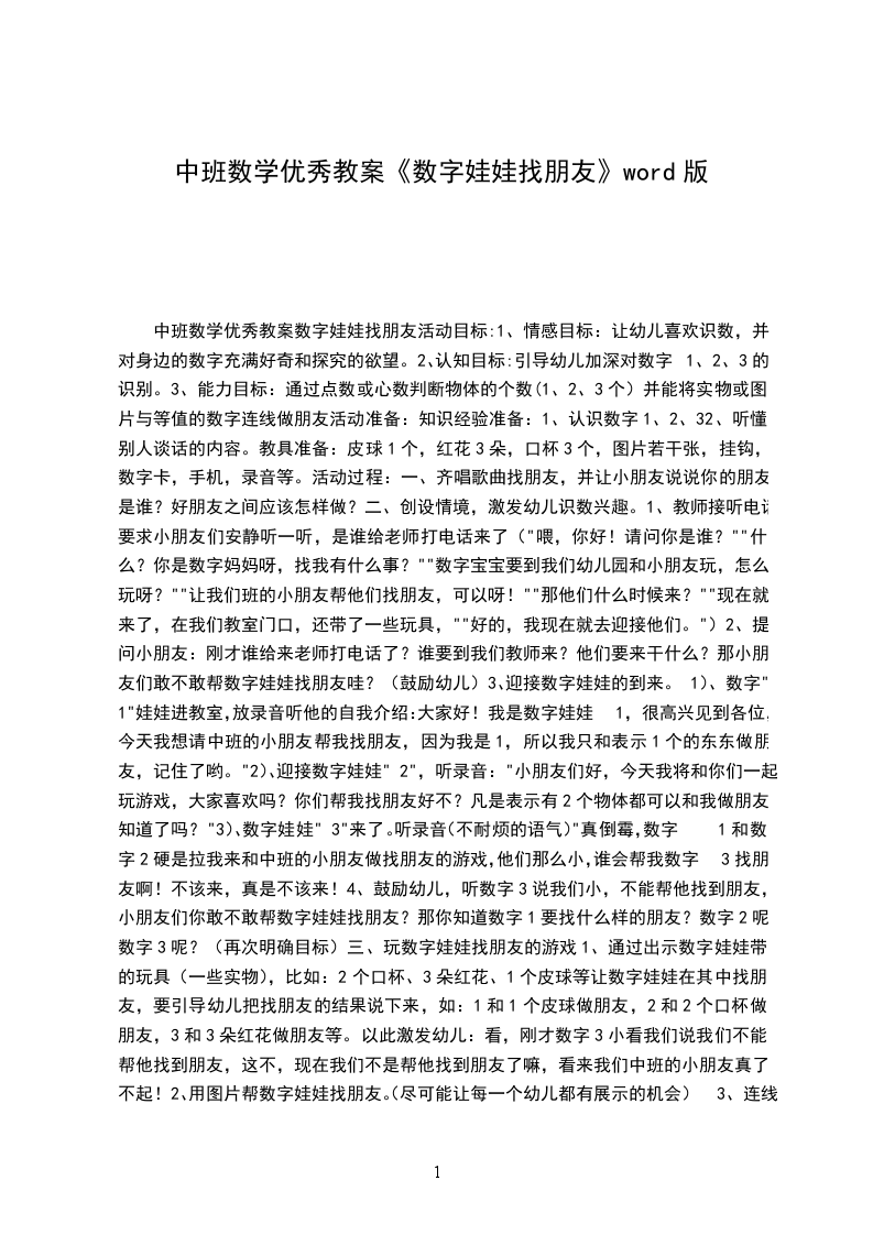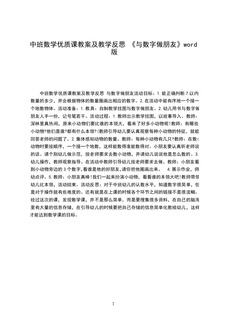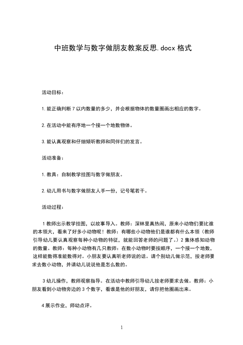活动过程:1教师出示教学挂图,以故事导入。教师:深林里真热闹,原来小动物们要比谁的本领大,看来了好多小动物呢!教师:有哪些小动物?他们是谁?都有什么本领?(教师引导幼儿要认真观察每种小动物的特征,就能回答老师的问题了。2集体感知动物的数量。教师:每种小动物有几只?教师:在数小动物时要按顺序,一个接一个地数,这样能数得准能数得对。小朋友要认真听老师说的话。请个别幼儿做示范,按老师要求去数小动物,并请幼儿说说他是怎么数的。3幼儿操作,教师观察指导。在活动中教师引导幼儿按老师要求去做。教师:小朋友看到小动物旁边的3个数字,看谁是他的好朋友,请你把他圈画出来。4展示作业,师幼点评。5教师:小朋友真棒!我们一起来扮演小动物,看看谁的本领大吧!教师带领幼儿比本领,活动结束。