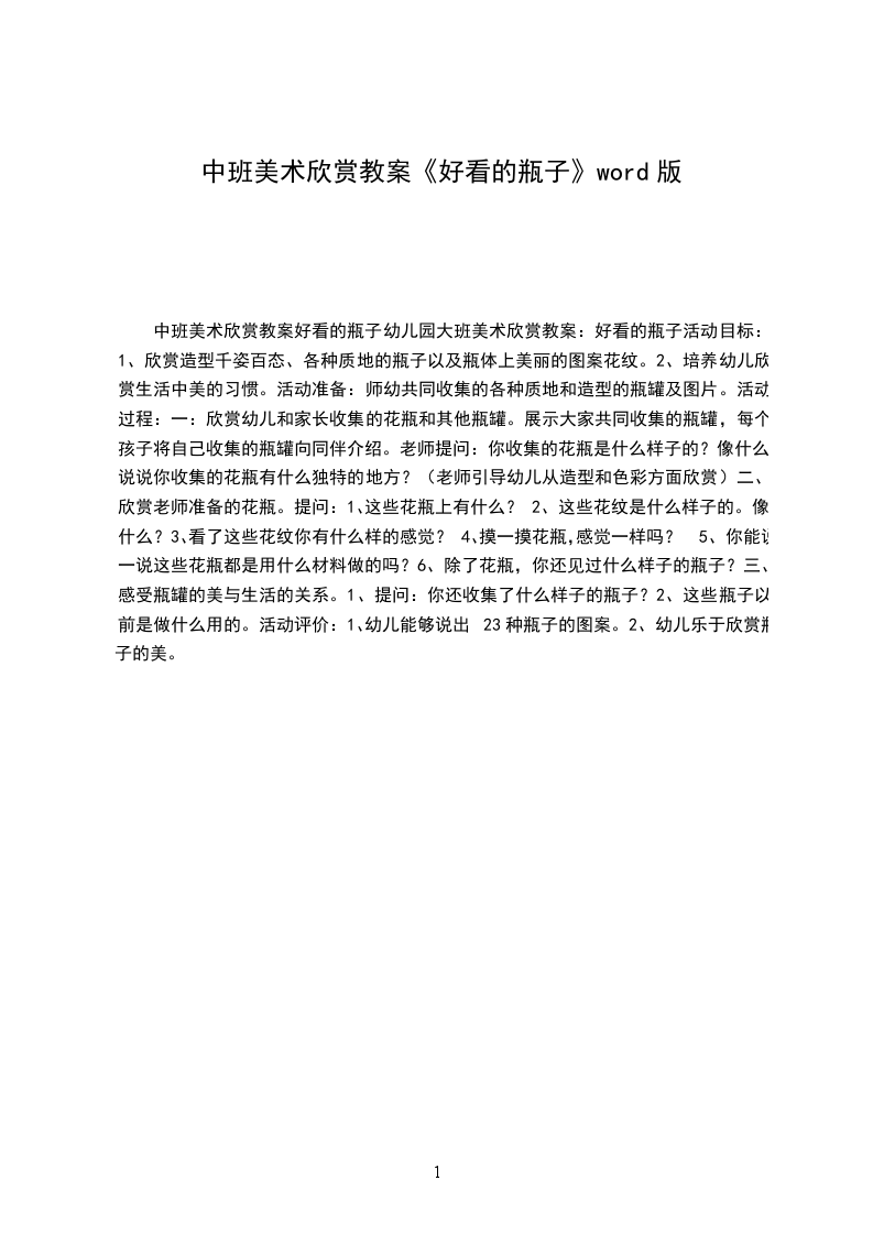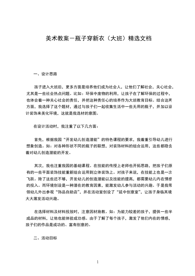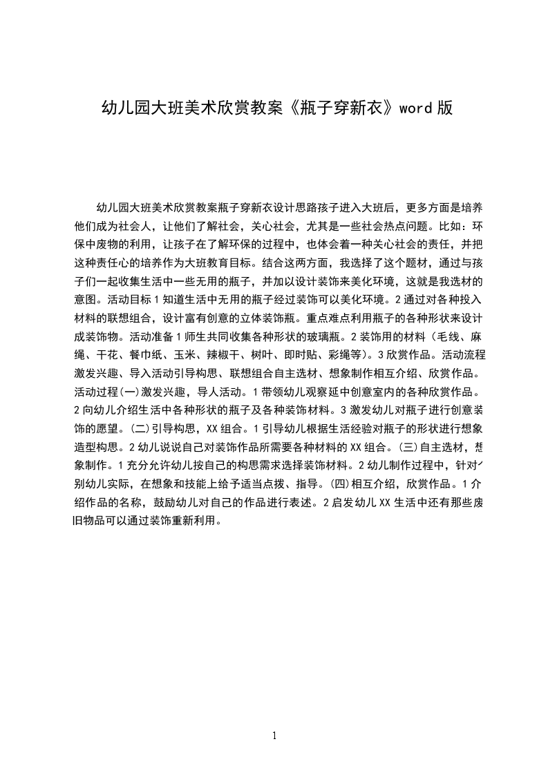 幼儿园大班美术欣赏教案瓶子穿新衣设计思路孩子进入大班后,更多方面是培养他们成为社会人,让他们了解社会,关心社会,尤其是一些社会热点问题。比如:环保中废物的利用,让孩子在了解环保的过程中,也体会着一种关心社会的责任,并把这种责任心的培养作为大班教育目标。结合这两方面,我选择了这个题材,通过与孩子们一起收集生活中一些无用的瓶子,并加以设计装饰来美化环境,这就是我选材的意图。活动目标1知道生活中无用的瓶子经过装饰可以美化环境。2通过对各种投入材料的联想组合,设计富有创意的立体装饰瓶。重点难点利用瓶子的各种形状来设计成装饰物。活动准备1师生共同收集各种形状的玻璃瓶。2装饰用的材料(毛线、麻绳、干花、餐巾纸、玉米、辣椒干、树叶、即时贴、彩绳等)。3欣赏作品。活动流程激发兴趣、导入活动引导构思、联想组合自主选材、想象制作相互介绍、欣赏作品。活动过程