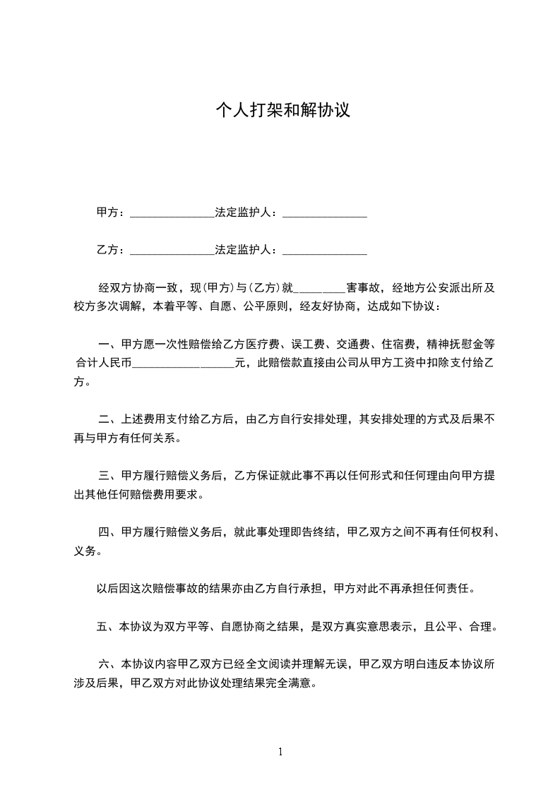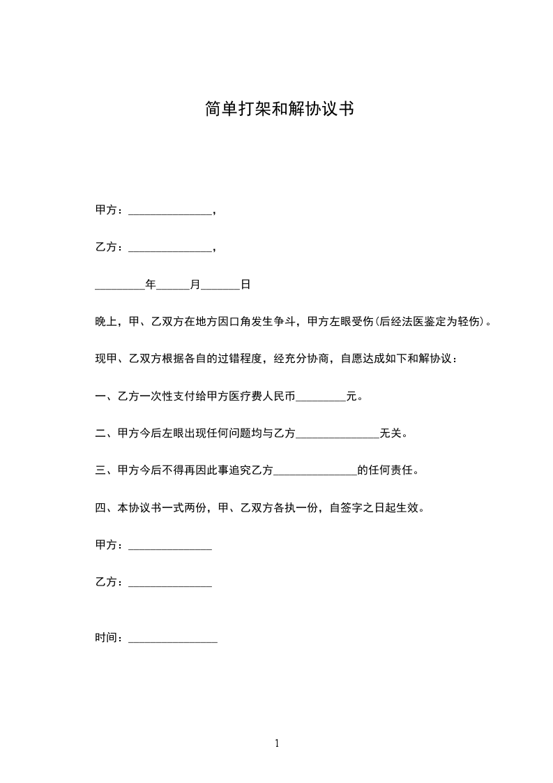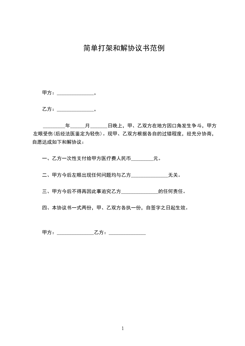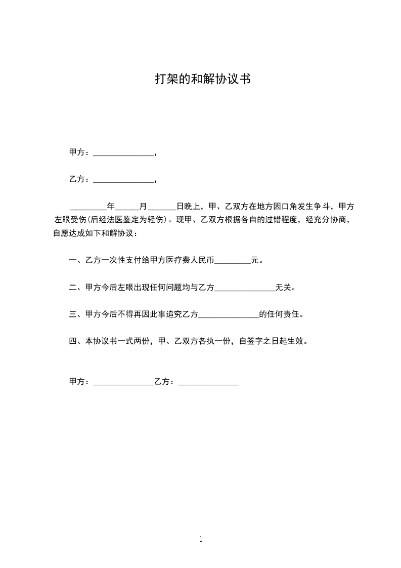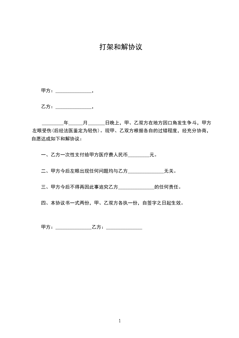 _________年______月_______日晚上,甲、乙双方在地方因口角发生争斗,甲方左眼受伤(后经法医鉴定为轻伤)。现甲、乙双方根据各自的过错程度,经充分协商,自愿达成如下协议:
