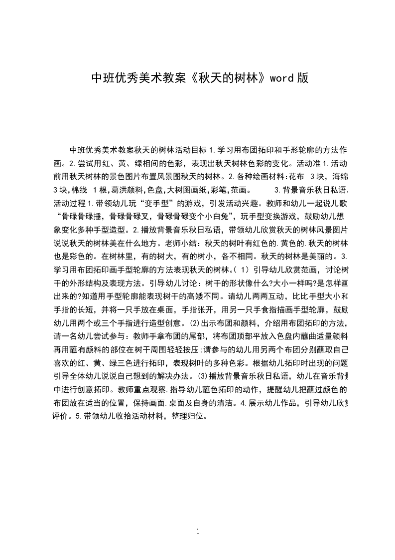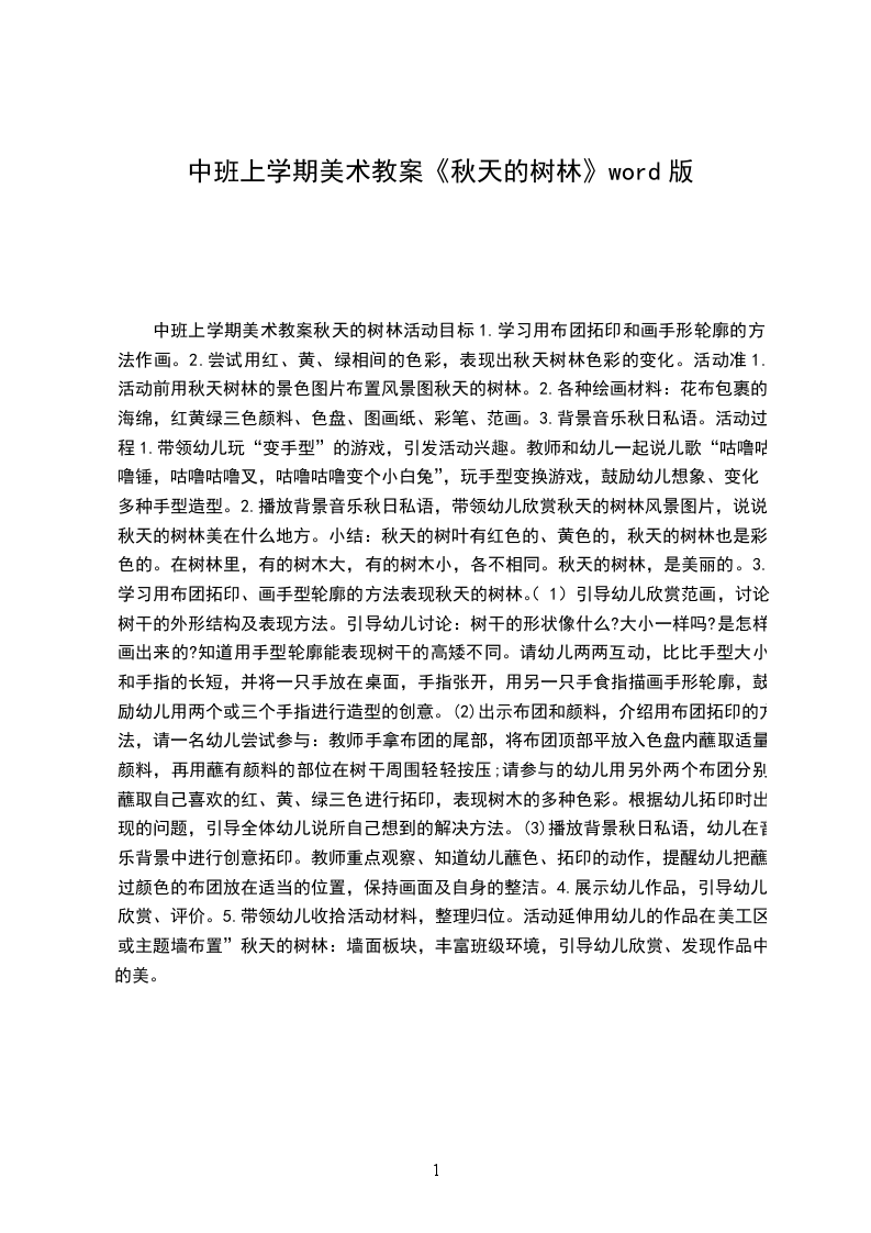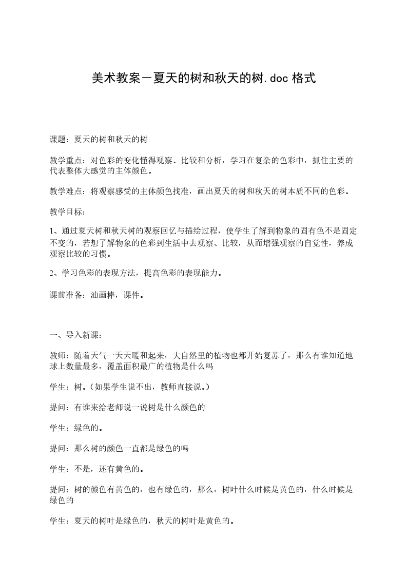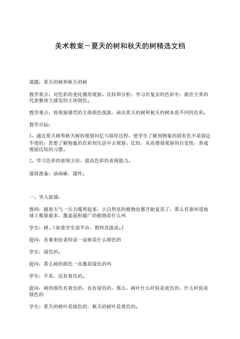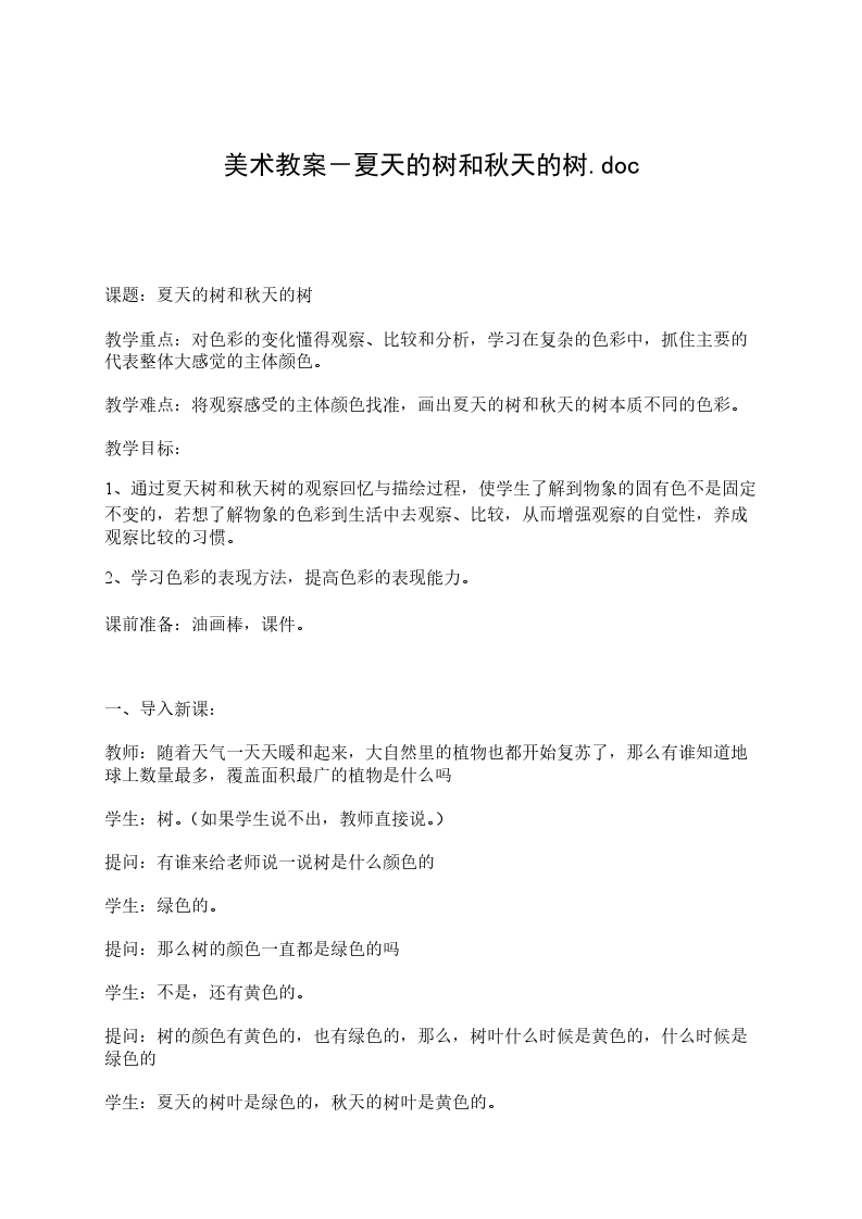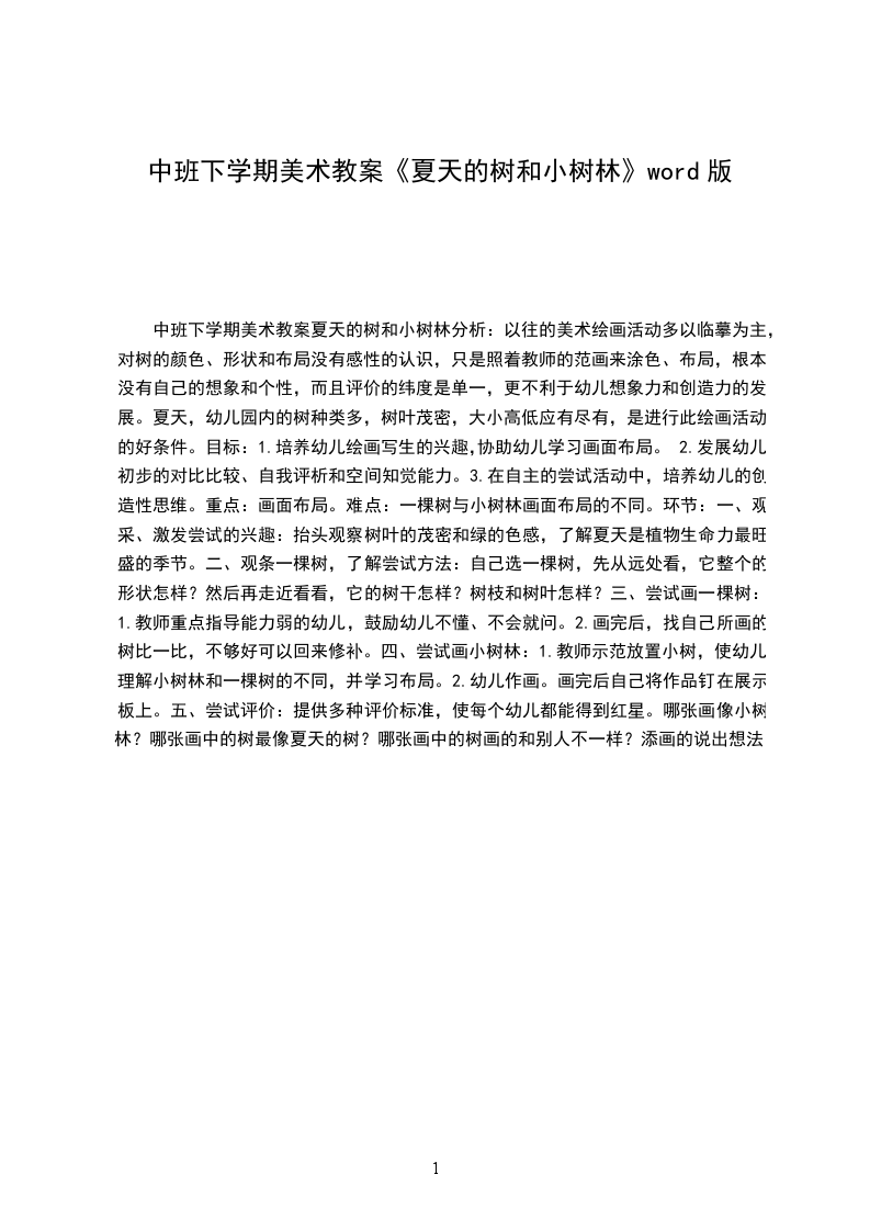 中班下学期美术教案夏天的树和小树林分析:以往的美术绘画活动多以临摹为主,对树的颜色、形状和布局没有感性的认识,只是照着教师的范画来涂色、布局,根本没有自己的想象和个性,而且评价的纬度是单一,更不利于幼儿想象力和创造力的发展。夏天,幼儿园内的树种类多,树叶茂密,大小高低应有尽有,是进行此绘画活动的好条件。目标: