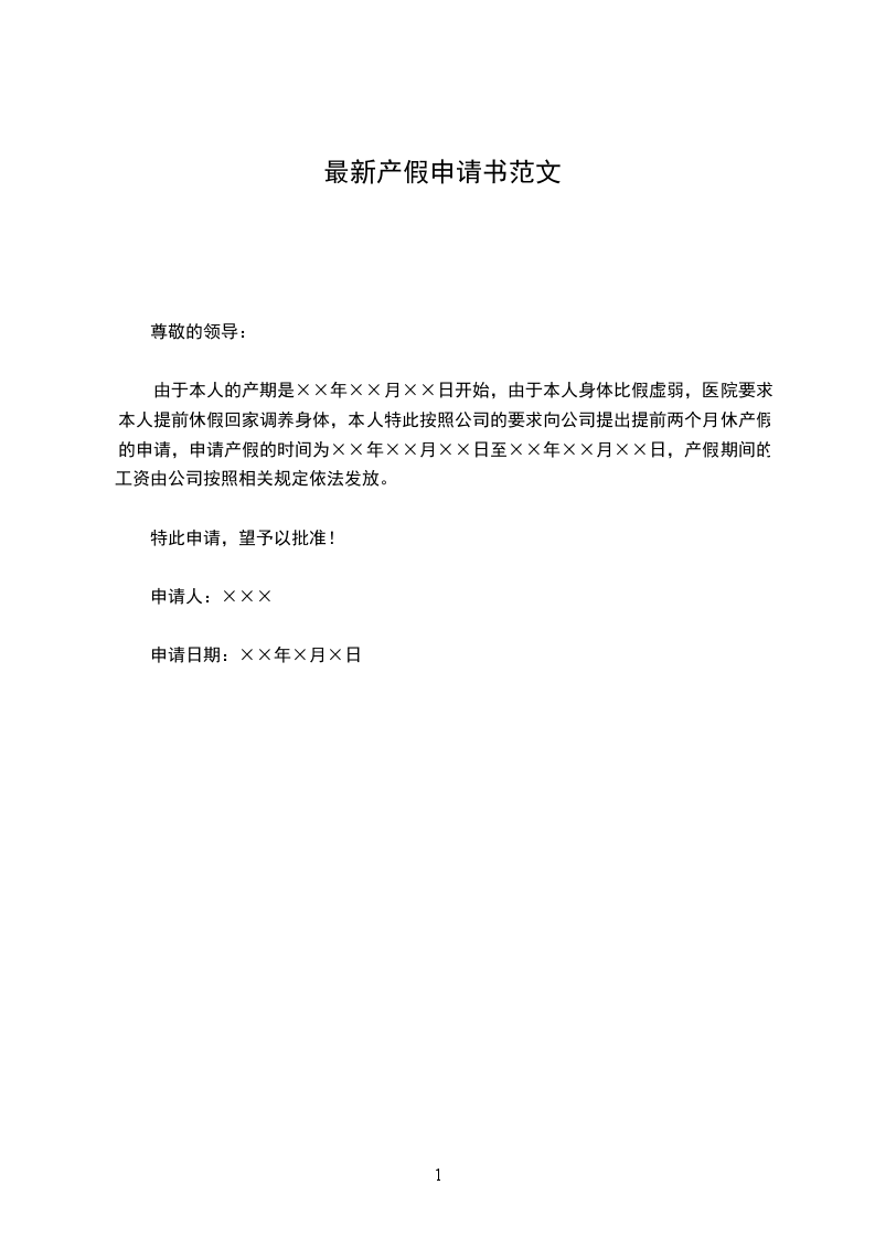 由于本人的产期是××年××月××日开始,由于本人身体比假虚弱,医院要求本人提前休假回家调养身体,本人特此按照公司的要求向公司提出提前两个月休产假的申请,申请产假的时间为××年××月××日至××年××月××日,产假期间的工资由公司按照相关规定依法发放。