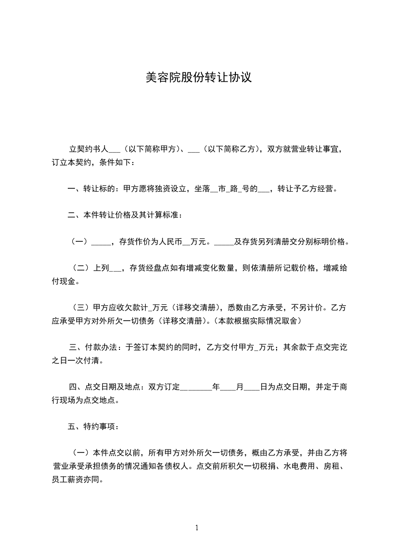 立契约书人___(以下简称甲方)、___(以下简称乙方),双方就营业转让事宜,订立本契约,条件如下: