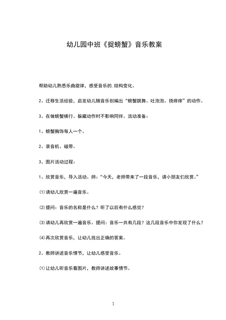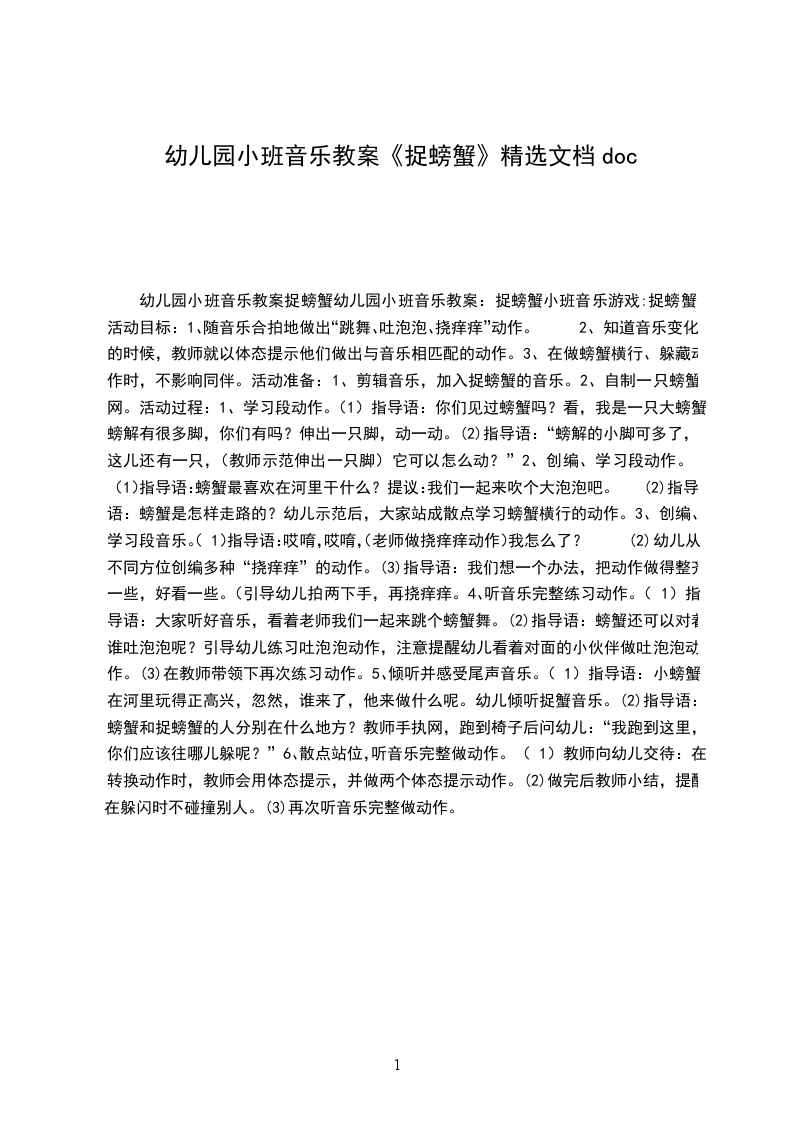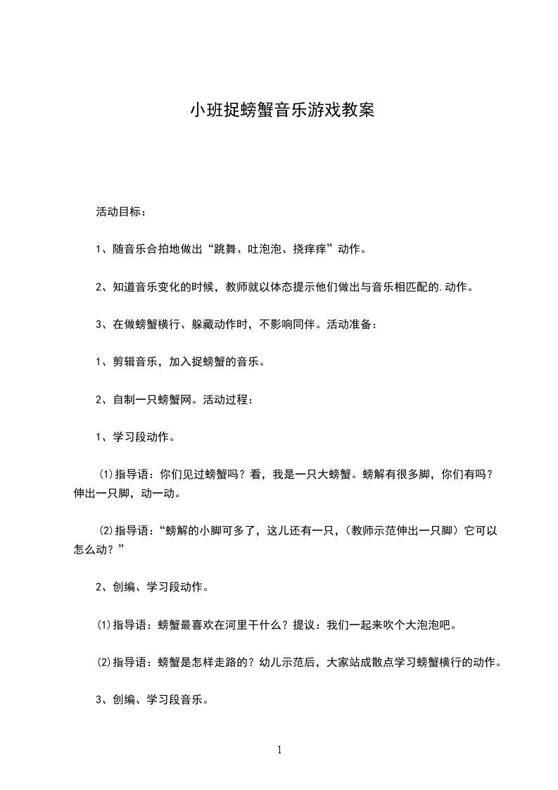 幼儿园小班音乐教案捉螃蟹幼儿园小班音乐教案:捉螃蟹小班音乐游戏:捉螃蟹活动目标:
