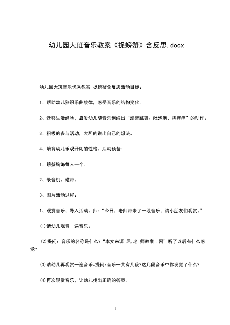 (1)指导语:小螃蟹在河里玩得正高兴,忽然,谁来了,他来做什么呢。幼儿倾听捉蟹音乐。
