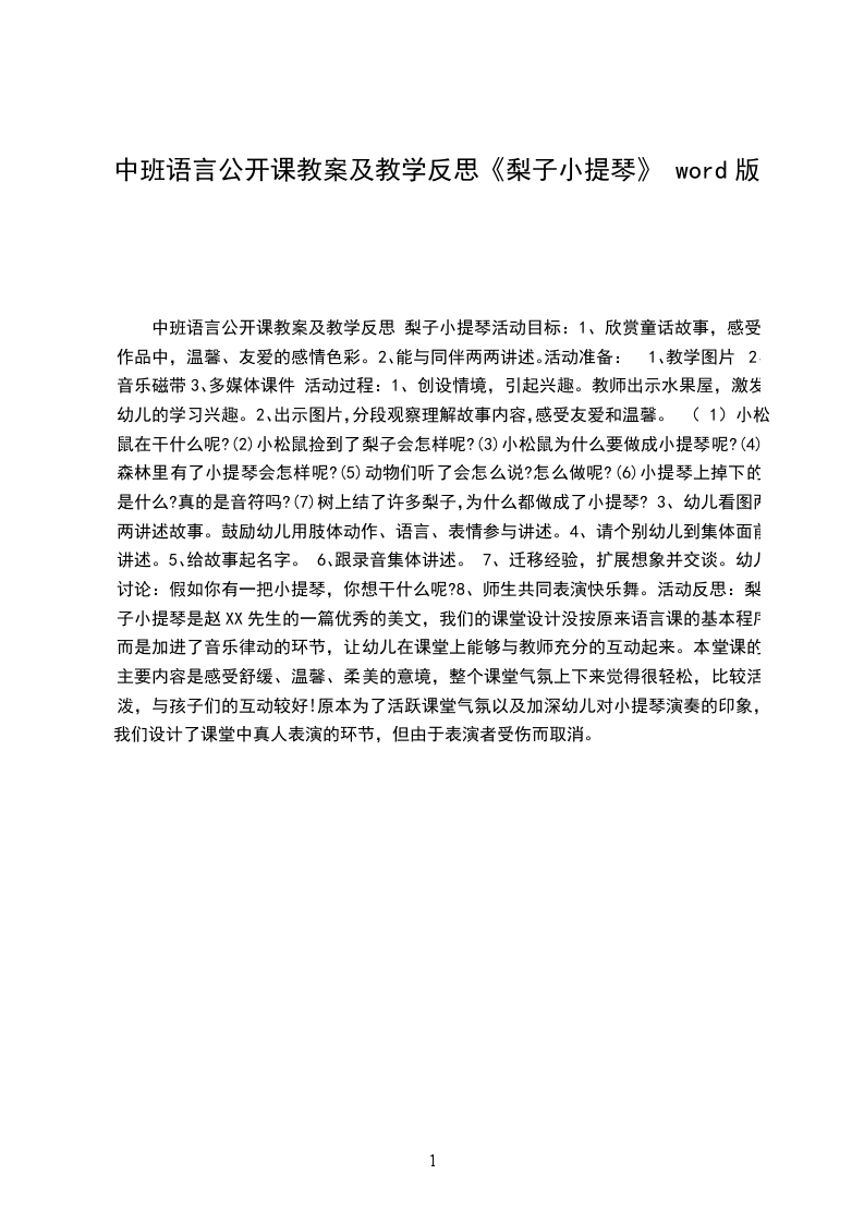 8、师生共同表演快乐舞。活动反思:梨子小提琴是赵XX先生的一篇优秀的美文,我们的课堂设计没按原来语言课的基本程序,而是加进了音乐律动的环节,让幼儿在课堂上能够与教师充分的互动起来。本堂课的主要内容是感受舒缓、温馨、柔美的意境,整个课堂气氛上下来觉得很轻松,比较活泼,与孩子们的互动较好!原本为了活跃课堂气氛以及加深幼儿对小提琴演奏的印象,我们设计了课堂中真人表演的环节,但由于表演者受伤而取消。