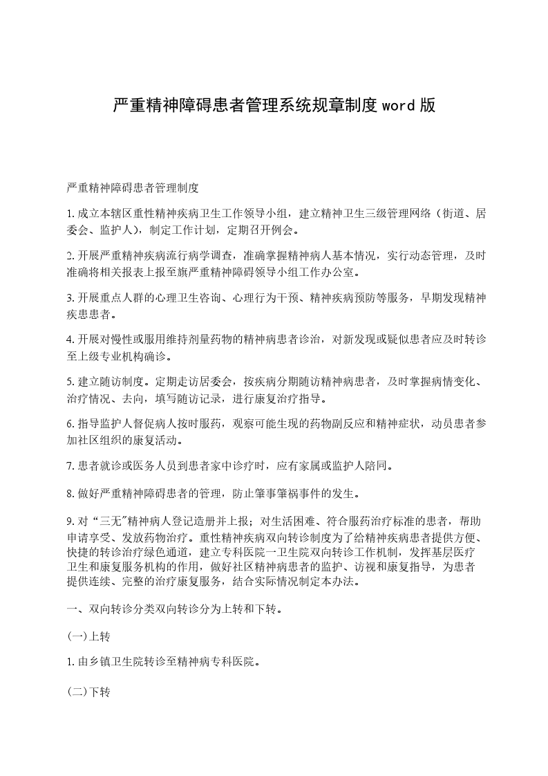 9.对“三无"精神病人登记造册并上报;对生活困难、符合服药治疗标准的患者,帮助申请享受、发放药物治疗。重性精神疾病双向转诊制度为了给精神疾病患者提供方便、快捷的转诊治疗绿色通道,建立专科医院一卫生院双向转诊工作机制,发挥基层医疗卫生和康复服务机构的作用,做好社区精神病患者的监护、访视和康复指导,为患者提供连续、完整的治疗康复服务,结合实际情况制定本办法。