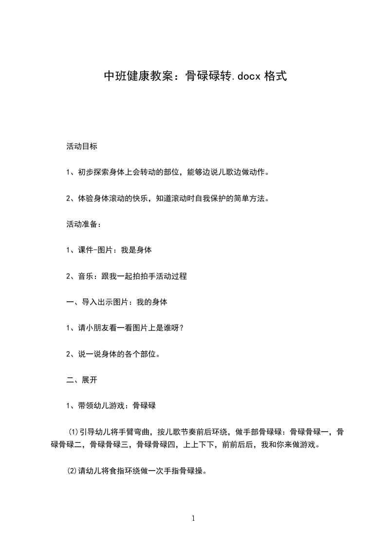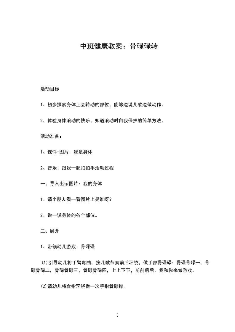 2、边说儿歌边转动身体相应的部位:"我的头骨碌碌,我的小手骨碌碌,我的小脚骨碌碌."教师:小朋友们我们来做个游戏,游戏的名字叫"身体骨碌碌",当老师说,我的头儿骨碌碌的时候你们就转动头,说我的小手骨碌碌的时候你们就转动手,说我的屁股骨碌碌的时候就转动你们的小屁股,说我的膝盖骨碌碌的时候就转动膝盖,说我的小脚骨碌碌的时候就转动脚,我来看看谁最能干,小耳朵最会听,转得最漂亮。仔细听开始了"我的头儿骨碌碌,我的手儿骨碌碌,我的膝盖骨碌碌,我的小脚骨碌碌,我的屁股骨碌碌"