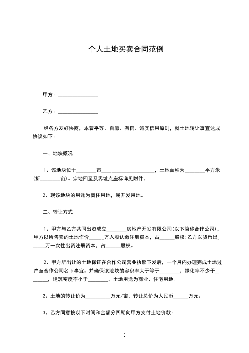 1、甲方与乙方共同出资成立________房地产开发有限公司(以下简称合作公司),甲方以所售卖的土地作价______万入股认缴注册资本,占______股权;乙方以货币出______万一次性出资注册资本,占______股权。