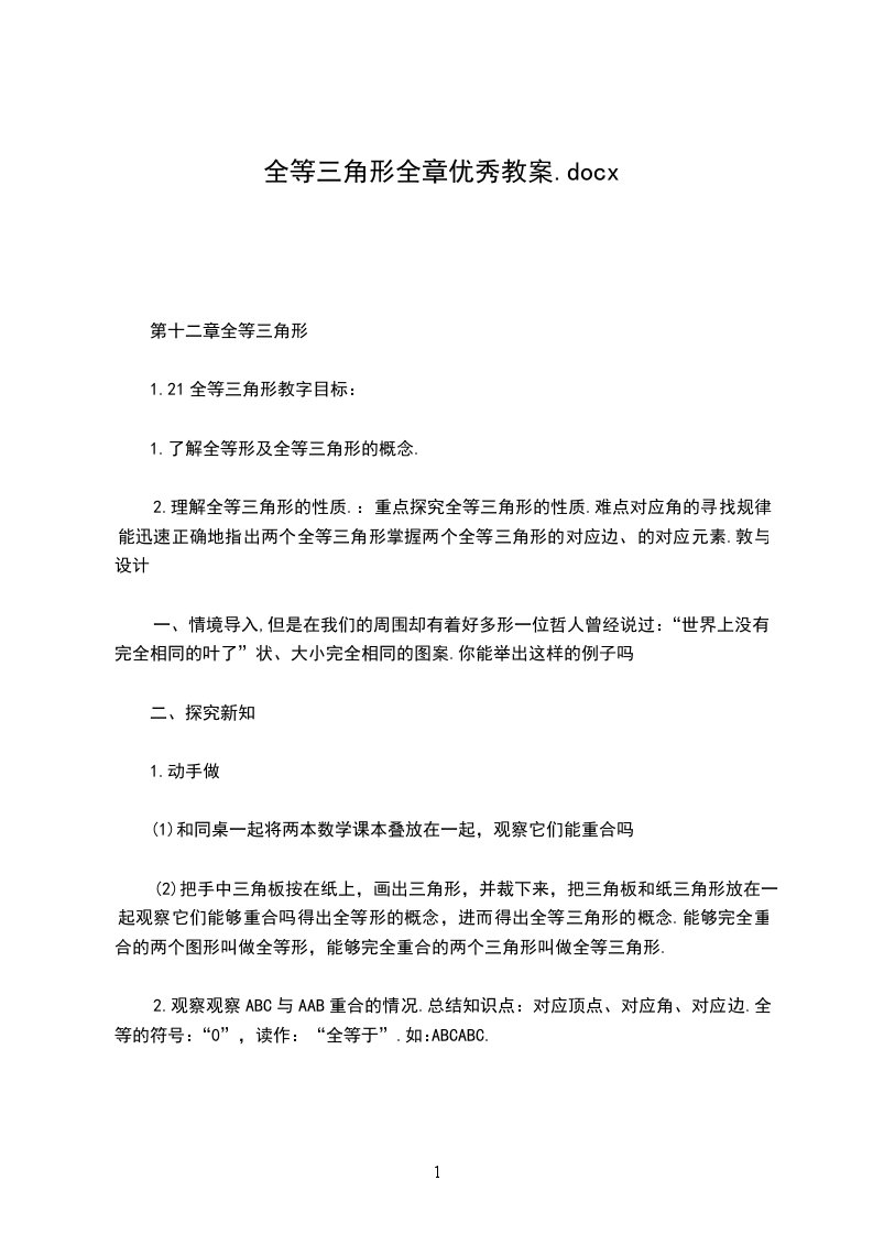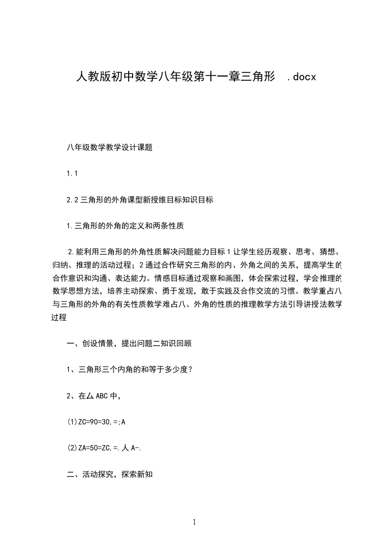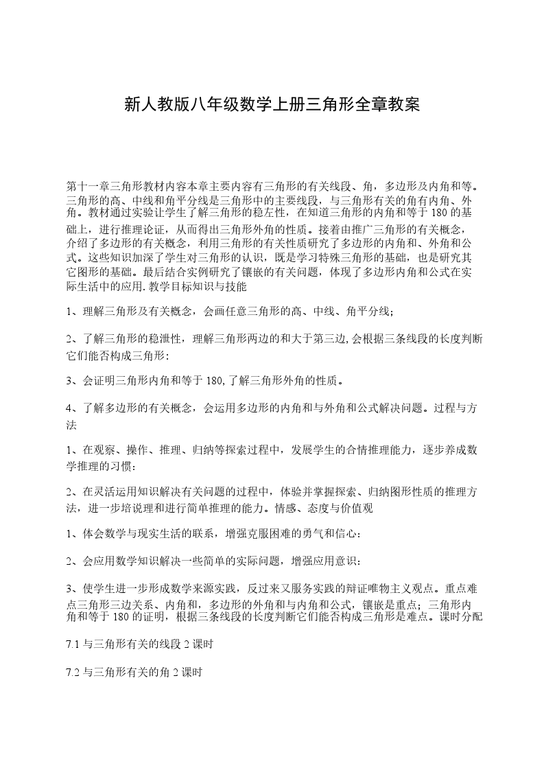 第十一章三角形教材内容本章主要内容有三角形的有关线段、角,多边形及内角和等。三角形的髙、中线和角平分线是三角形中的主要线段,与三角形有关的角有内角、外角。教材通过实验让学生了解三角形的稳左性,在知道三角形的内角和等于180的基础上,进行推理论证,从而得出三角形外角的性质。接着由推广三角形的有关概念,介绍了多边形的有关槪念,利用三角形的有关性质研究了多边形的内角和、外角和公式。这些知识加深了学生对三角形的认识,既是学习特殊三角形的基础,也是研究其它图形的基础。最后结合实例研究了镶嵌的有关问题,体现了多边形内角和公式在实际生活中的应用.教学目标知识与技能