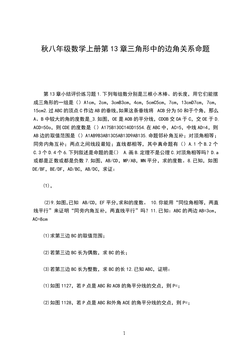 2、三角形的三条髙、三条中线、三条角平分线及交点的位置规律。作业:课本习题11第3、4、8题。