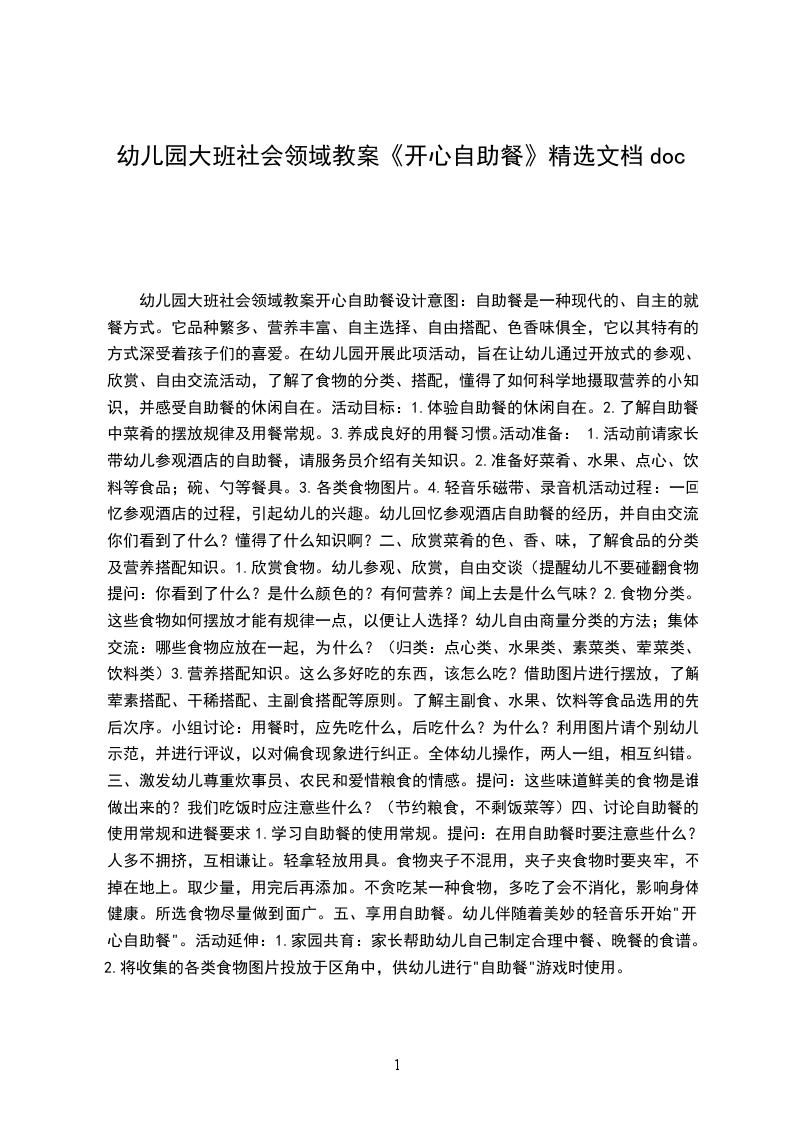 幼儿园大班社会领域教案开心自助餐设计意图:自助餐是一种现代的、自主的就餐方式。它品种繁多、营养丰富、自主选择、自由搭配、色香味俱全,它以其特有的方式深受着孩子们的喜爱。在幼儿园开展此项活动,旨在让幼儿通过开放式的参观、欣赏、自由交流活动,了解了食物的分类、搭配,懂得了如何科学地摄取营养的小知识,并感受自助餐的休闲自在。活动目标: