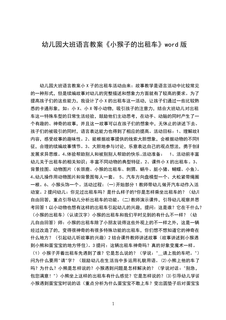 一、活动背景:幼儿最喜欢听讲故事,但是传统的教学模式已不能满足大班幼儿积极思考、乐于表现的强烈愿望。故事小X的出租车讲述了小X开着一辆普通的出租车,乐于帮助有困难的同伴,这对于现在以自我为中心、遇到困难易退缩的独生子女来说是一个很好的教育契机;而活动过程中注重师幼互动、幼幼互动,激发幼儿积极思维、大胆求异、自主表达、勇于续编。