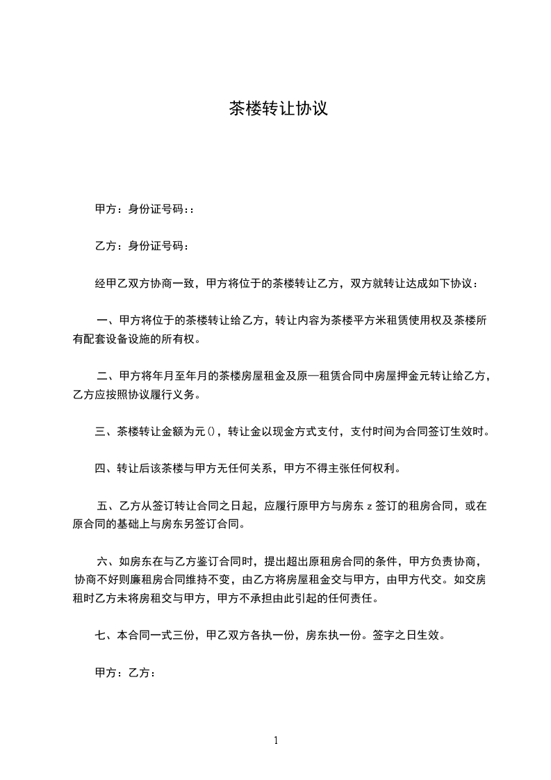 一、甲方将位于的茶楼转让给乙方,转让内容为茶楼平方米租赁使用权及茶楼所有配套设备设施的所有权。