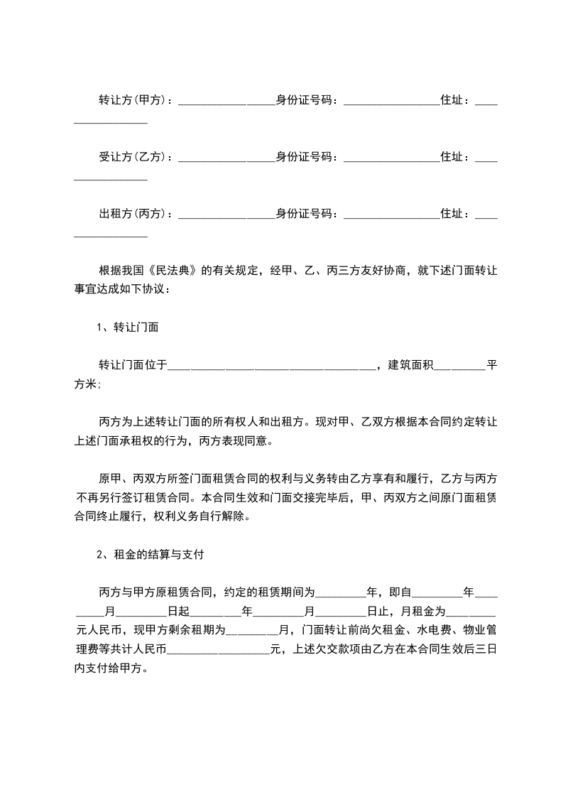 (三)商号现承租坐落____市__路__号的租赁权,由甲方让与乙方,并由甲方负责出租人与乙方办理续租________年,与乙方另行换立租约,如出租人不允许续租或要求增加租金或提出其他条件,致乙方受害时,甲方应负赔偿责任。