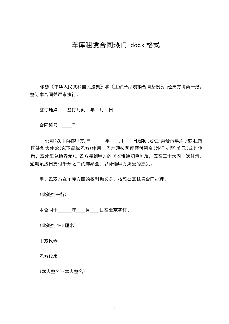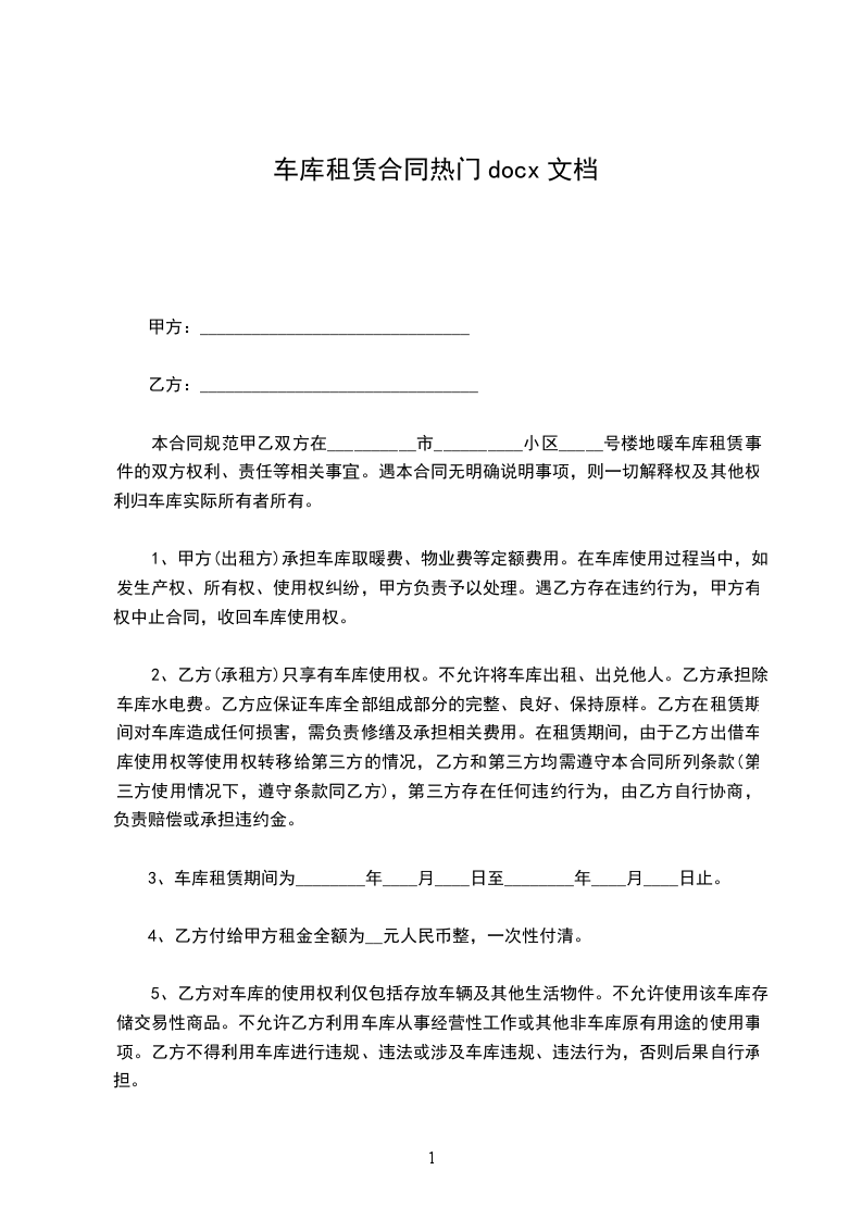 2、该车库租赁期年,即_年_月_日至_年_月1_日。该合同到期时,乙方如需续约,需提前三十天告知甲方,并按市场价重新商定租金。