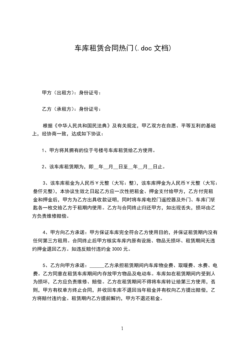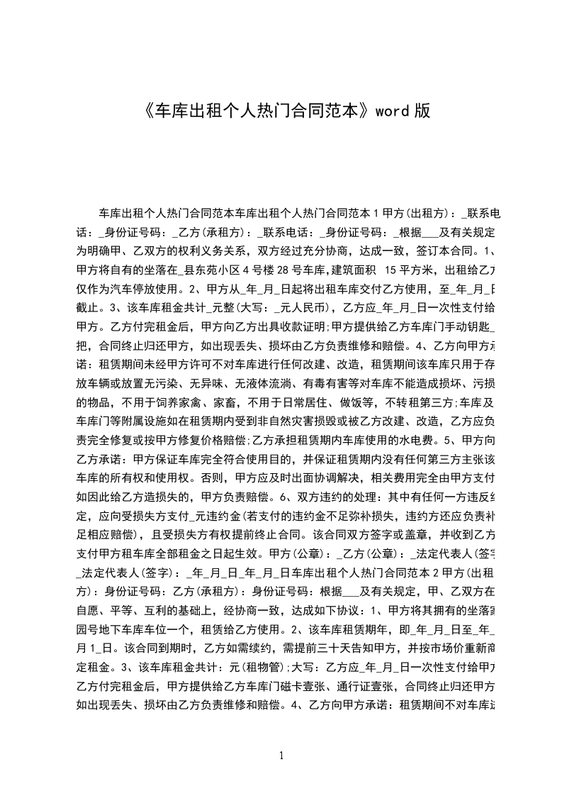 车库出租个人热门合同范本车库出租个人热门合同范本1甲方(出租方):_联系电话:_身份证号码:_乙方(承租方):_联系电话:_身份证号码:_根据___及有关规定,为明确甲、乙双方的权利义务关系,双方经过充分协商,达成一致,签订本合同。