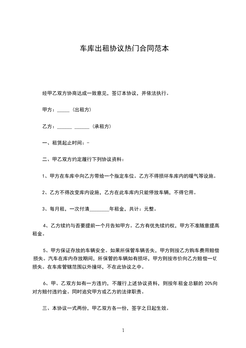 6、双方违约的处理:其中有任何一方违反约定,应向受损失方支付_元违约金(若支付的违约金不足弥补损失,违约方还应负责补足相应赔偿),且受损失方有权提前终止合同。该合同双方签字或盖章,并收到乙方支付甲方租车库全部租金之日起生效。