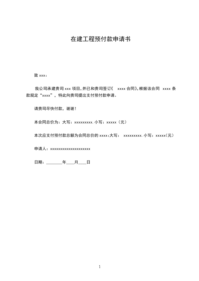 我公司承建贵司xxx项目,并已和贵司签订《xxxx合同》,根据该合同xxxx条款规定“xxxx”,特此向贵司提出支付预付款申请。