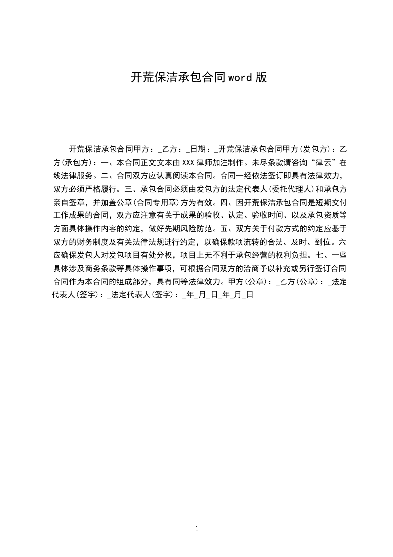 四、因开荒保洁承包合同是短期交付工作成果的合同,双方应注意有关于成果的验收、认定、验收时间、以及承包资质等方面具体操作内容的约定,做好先期风险防范。