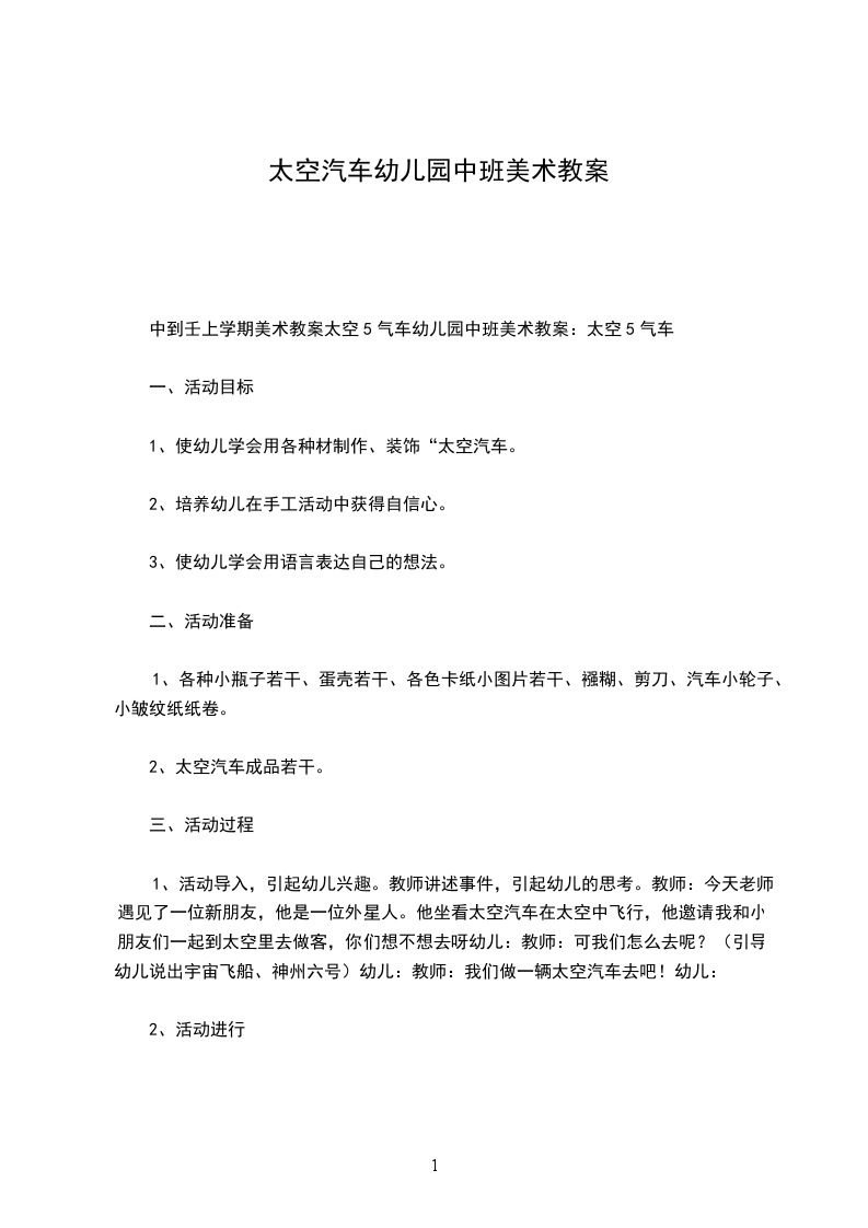 1、活动导入,引起幼儿兴趣。教师讲述事件,引起幼儿的思考。教师:今天老师遇见了一位新朋友,他是一位外星人。他坐着太空汽车在太空中飞行,他邀请我和小朋友们一起到太空里去做客,你们想不想去呀?幼儿:教师:可我们怎么去呢?(引导幼儿说出宇宙飞船、神州六号)幼儿:教师:我们做一辆太空汽车去吧!幼儿: