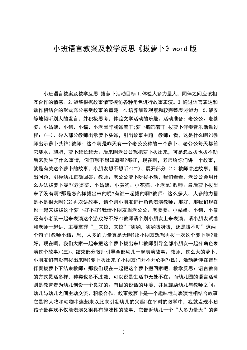 (四)、活动延伸在音乐伴奏拔萝卜下结束教师:那我们现在一起把这个萝卜搬回家吧。教学反思:语言教育的方式灵活多样,种类也多不胜数,可以说是生活中无处不在。而幼儿园的语言活动则是教育者为幼儿创设一个良好的、有目的说话的环境,并且鼓励幼儿与教师之间、幼儿与幼儿之间主动交流、积极合作。故事拔萝卜是一个趣味性与表演性相结合故事,它是将人物和动物串连起来以此来引发幼儿的兴趣!在平时的教学中,我就发现小班孩子最喜欢不仅能表演又很具有趣味性的故事,它告诉幼儿一个“人多力量大”的道理,告诉幼儿遇到自己解决不了的困难时,可以寻求他人的帮助。在拔萝卜的教学中,在讲故事时,我注意了语速较慢,吐字清晰,语言生动,并特意加重了“拔、拉、帮”的读音,加上多次地重复,幼儿很快便学会了这三个词,从而达到了本活动目标中丰富词汇这一项目标;复述故事阶段也是一个识记的过程,孩子在复述故事时不仅可以加深对故事内容的理解与记忆,同时回答问题也锻炼了幼儿语言组织能力。在回答问题时,小朋友们都很积极,回答地也很准确,这说明孩子们能把简短的,重复性强的对话记清楚。在做“拔”的动作时,他们都纷纷主动站起来,模仿老师做着拔萝卜的动作。让幼儿通过表演故事,使幼儿对故事情节,内容进行了深刻的认识和理解。每幅图片是以故事的形式出现的,那丰富多彩的画面,生动的人物形象深深的吸引了幼儿的注意。我先出现大萝卜和老爷爷,接着便出现了老婆婆、小狗儿、花猫、小耗子的形象。看完后,我便以问题的形式开始问幼儿,“故事中你看到哪些人去帮老公公的啊?”幼儿能把大部分的人物给说出来,“那谁先去的呢?接着又去了谁?还有谁啊?”通过一系列问题的提出来激发幼儿的回忆,并再次完整的欣赏故事,让幼儿带着问题带着思考来听故事,以此来抓住幼儿的注意力,在第二遍的倾听中,幼儿对我提出的问题基本能回答出来了,而且兴趣依然很高涨。