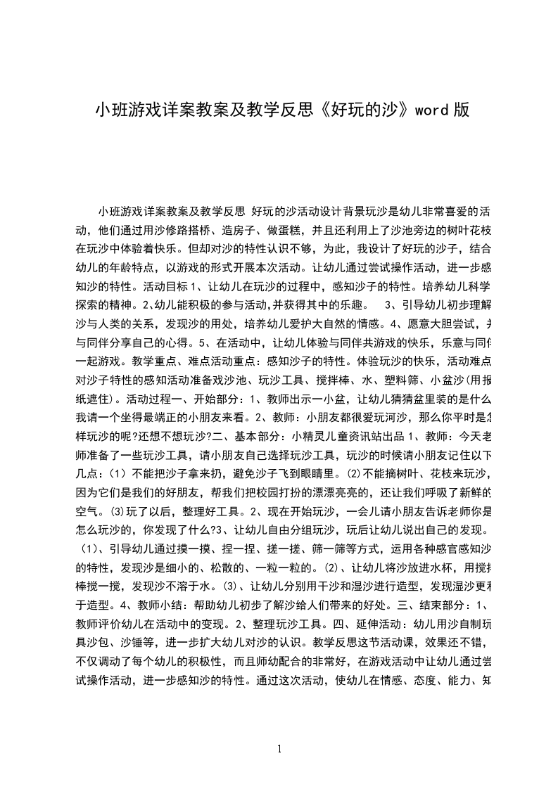 小班游戏详案教案及教学反思 好玩的沙活动设计背景玩沙是幼儿非常喜爱的活动,他们通过用沙修路搭桥、造房子、做蛋糕,并且还利用上了沙池旁边的树叶花枝,在玩沙中体验着快乐。但却对沙的特性认识不够,为此,我设计了好玩的沙子,结合幼儿的年龄特点,以游戏的形式开展本次活动。让幼儿通过尝试操作活动,进一步感知沙的特性。活动目标