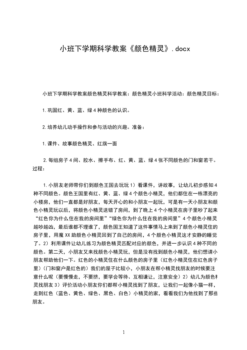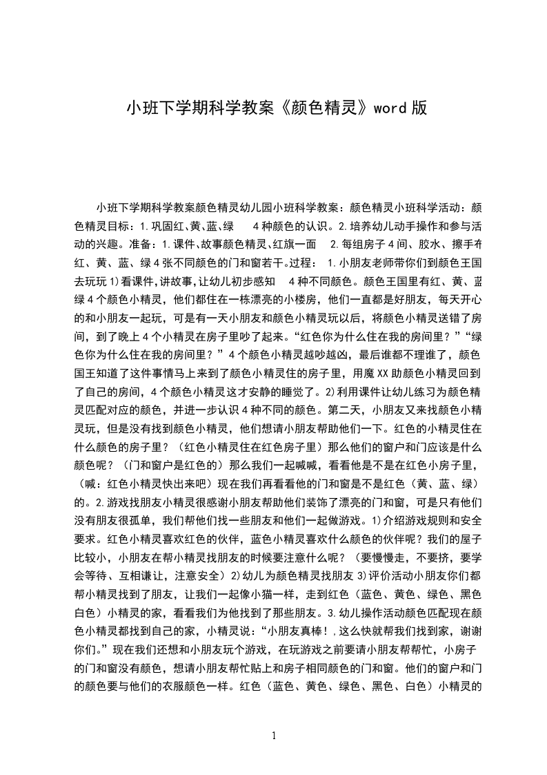 活动过程:小朋友老师带你们到颜色王国去玩玩1)看课件,讲故事,让幼儿初步感知4种不同颜色。颜色王国里有红、黄、蓝、绿4个颜色小精灵,他们都住在一栋漂亮的小楼房,他们一直都是好朋友,每天开心的和小朋友一起玩,可是有一天小朋友和颜色小精灵玩以后,将颜色小精灵送错了房间,到了晚上4个小精灵在房子里吵了起来。“红色你为什么住在我的房间里?”“绿色你为什么住在我的房间里?”4个颜色小精灵越吵越凶,最后谁都不理谁了,颜色国王知道了这件事情马上来到了颜色小精灵住的房子里,用魔XX助颜色小精灵回到了自己的房间,4个颜色小精灵这才安静的睡觉了。2)利用课件让幼儿练习为颜色精灵匹配对应的颜色,并进一步认识4种不同的颜色。第二天,小朋友又来找颜色小精灵玩,但是没有找到颜色小精灵,他们想请小朋友帮助他们一下。红色的小精灵住在什么颜色的房子里?(红色小精灵住在红色房子里)那么他们的窗户和门应该是什么颜色呢?(门和窗户是红色的)那么我们一起喊喊,看看他是不是在红色小房子里,(喊:红色小精灵快出来吧)现在我们再看看他的门和窗是不是红色(黄、蓝、绿)的。活动反思:本次活动中,幼儿的积极性都非常高,激发了幼儿对颜色的探索欲望,让幼儿在自己动手操作的过程中,发现颜色变化的规律。在幼儿动手操作橡皮泥时,老师没有提醒幼儿让幼儿用手指用力的搓橡皮泥,让两种颜色能够更好的融合到一起,变出第三种颜色,在动手操作这一环节中,应该让幼儿学习自己记录结果会更好。
