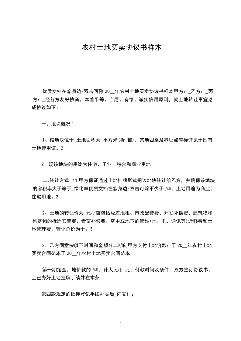 1、甲方诚邀乙方参与其________亩土地的第三方转让事宜,并承诺创造条件让乙方取得该块土地,若乙方未能取得该地块,甲方愿意双倍返还定金,计______万元,甲方应在确认乙方不能取得该土块的土地使用权之日起______个工作日内支付此款。
