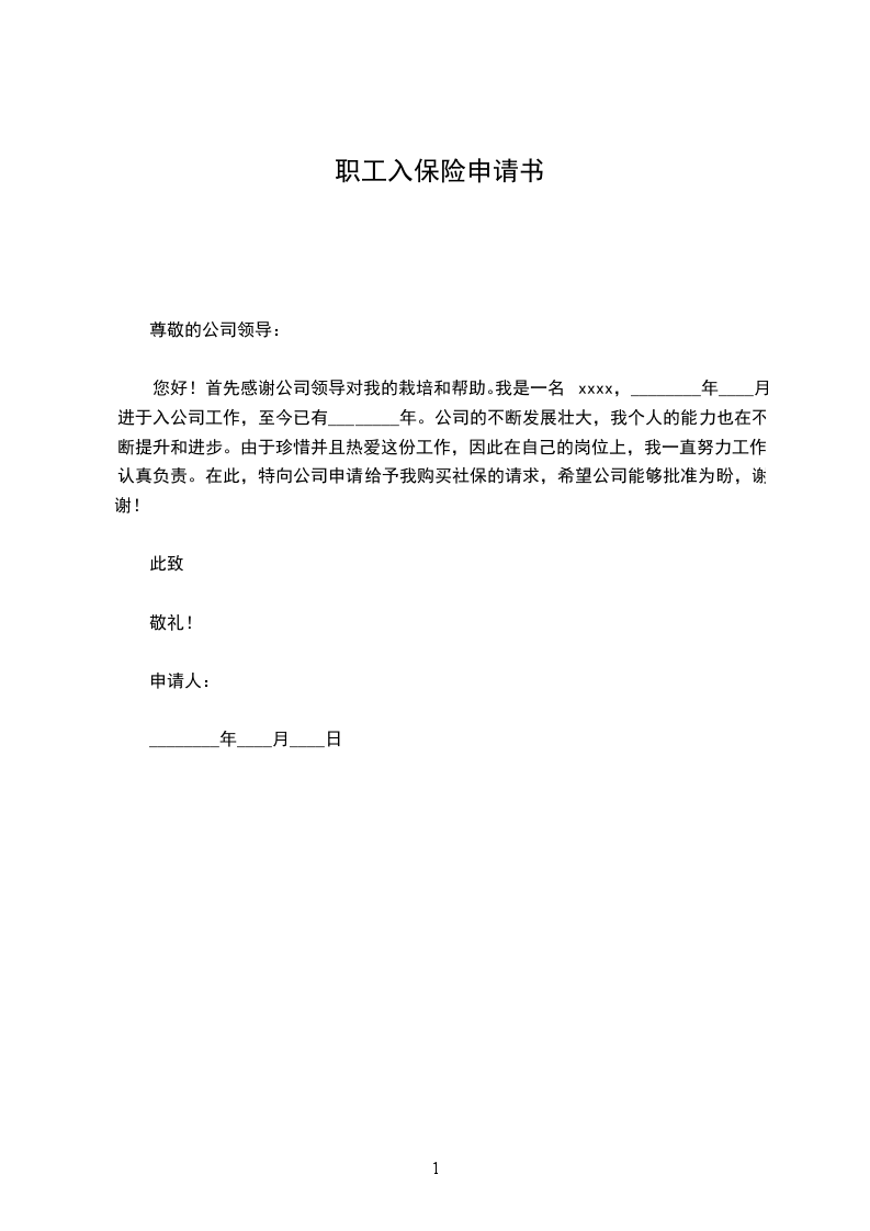 您好!首先感谢公司领导对我的栽培和帮助。我是一名xxxx,________年____月进于入公司工作,至今已有________年。公司的不断发展壮大,我个人的能力也在不断提升和进步。由于珍惜并且热爱这份工作,因此在自己的岗位上,我一直努力工作,认真负责。在此,特向公司申请给予我购买社保的请求,希望公司能够批准为盼,谢谢!