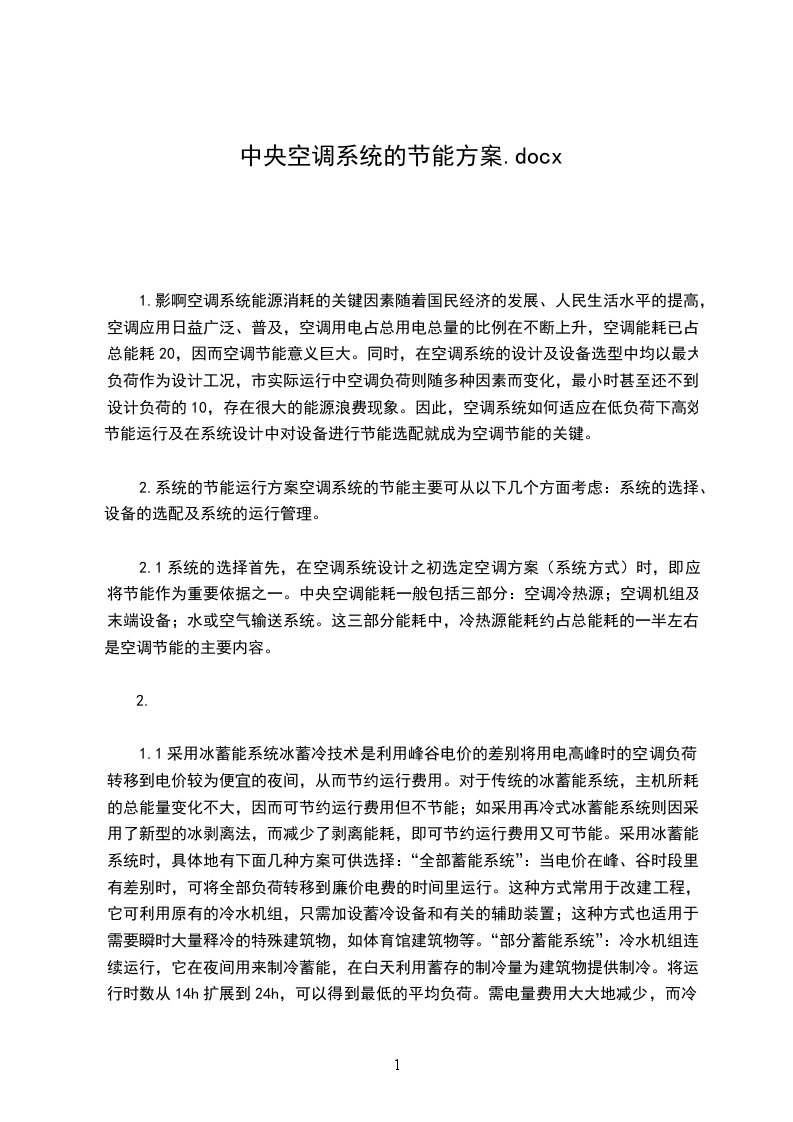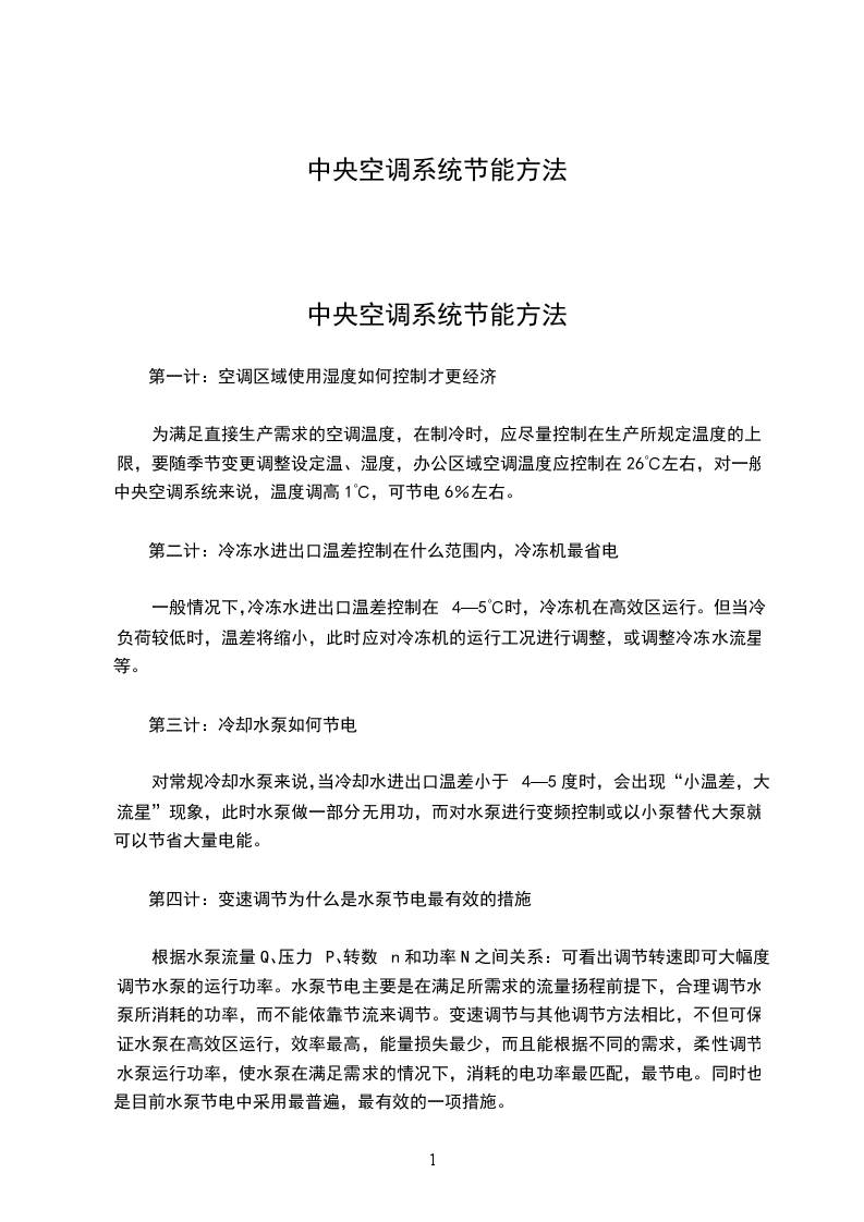 二、技术节能以上介绍的是通过行为管理来达到节能的目的事实证明这是一种有效的节能方式在某种程度上可以达到一定的节能效果但是管理节能的方式也有一定的局限性因为它不能从根本上解决中央空调所存在的巨大能源浪费问题。一般来说,中央空调系统的设计通常按建筑物所在地的极端气候条件来计算其最大冷负荷(或最大热负荷),并由此确定空调主机的装机容量及空调水系统的供水流量。然而,实际上每年只有极短时间出现最大冷负荷(或最大热负荷)的情况。因此,中央空调系统在绝大部分时间里,都是在部分负荷(远小于其额定容量)条件下运行。据统计,实际空调负荷平均只有设备能力的50%左右,因而出现了“大马拉小车”的现象,这无疑造成了大量的能源白白浪费。另一方面,空调负荷又具有变动性。由于受季节交替、气候变幻、昼夜轮回、使用变化及人流量增减等各种因素变化的影响,中央空调系统的负荷具有起伏变化和不恒定的特点。如果中央空调的运行方式不能根据负荷的变化而调节,始终在额定容量(即满负荷状态)下运行,势必造成巨大的能源浪费。随着科技的发展,现在,不少空调主机已能够根据负荷变化自动随之减载或加载,但输送空调水(冷冻水和冷却水)的水泵如果不能跟随负荷的变化做出相应的调节,始终在额定功率下运行,仍然会造成输送能量的很大浪费。目前,国内的中央空调系统,由于没有先进的技术手段支持,基本上都采用传统的定流量控制方式,即空调冷冻(温)水流量、冷却水流量和冷却风风量都是恒定的。也就是说,只要启动空调主机、冷冻水泵、冷却水泵和冷却塔风机都在工频状态下运行。定流量控制方式的特征是系统的循环水量保持定值不变,当负荷变化时,通过改变供水或回水温度来匹配,定流量供水方式的优点是系统简单,不需要复杂的控制设备。但这种控制方式存在以下问题: