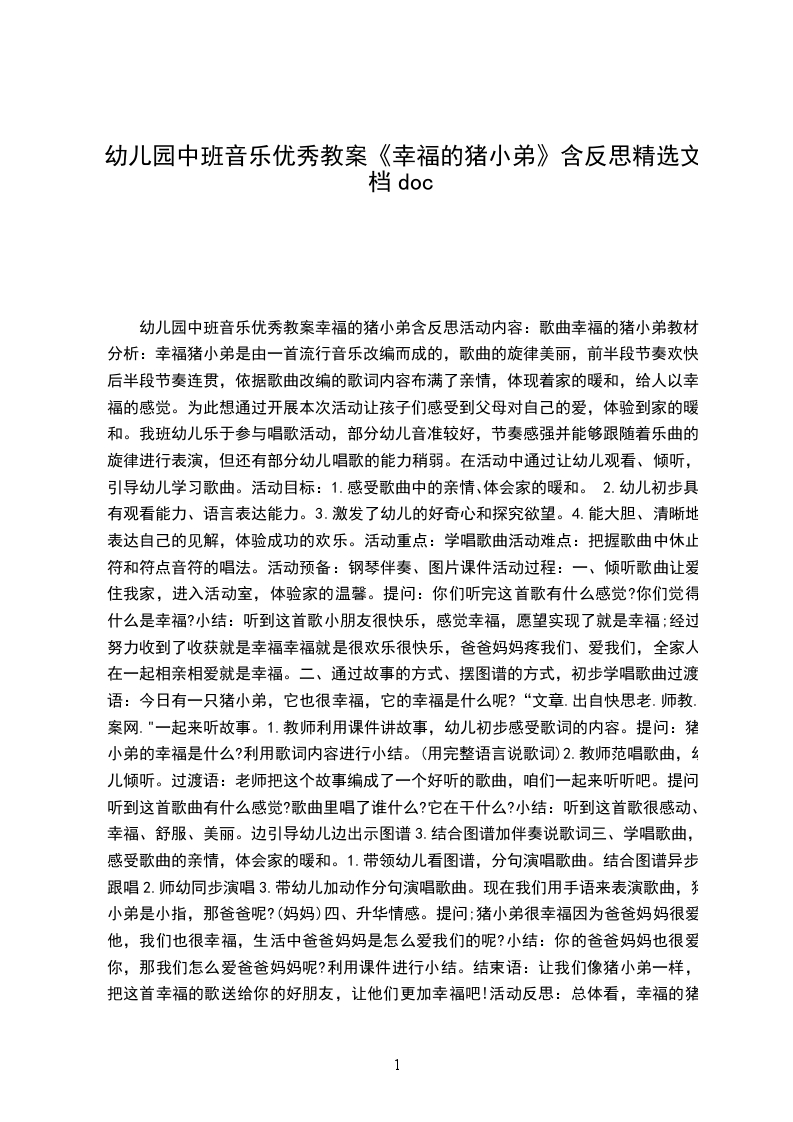 中班音乐优秀教案及教学反思 幸福的猪小弟活动内容:歌曲幸福的猪小弟教材分析:幸福猪小弟是由一首流行音乐改编而成的,歌曲的旋律优美,前半段节奏欢快,后半段节奏连贯,根据歌曲改编的歌词内容充满了亲情,体现着家的温暖,给人以幸福的感觉。为此想通过开展本次活动让孩子们感受到父母对自己的爱,体验到家的温暖。我班幼儿乐于参与歌唱活动,部分幼儿音准较好,节奏感强并能够跟随着乐曲的旋律进行表演,但还有部分幼儿歌唱的能力稍弱。在活动中通过让幼儿观察、倾听,引导幼儿学习歌曲。活动目标: