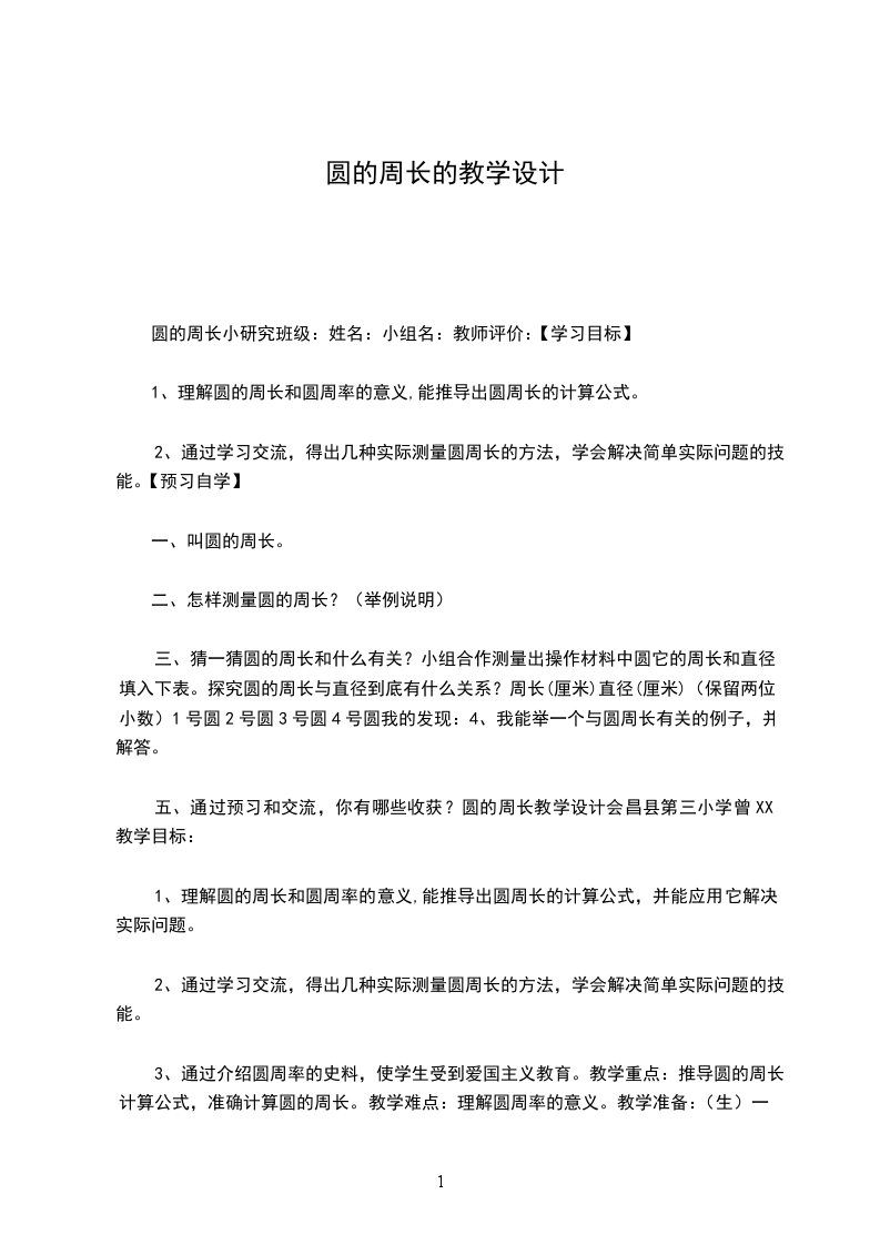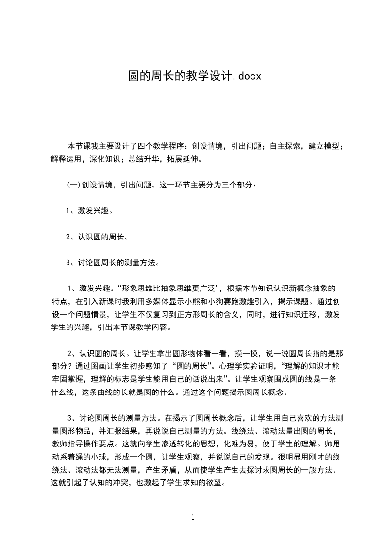 (二)设计思路本设计从学生的实际出发,通过测量圆的周长、探讨圆的周长与直径的关系、推导圆的周长计算公式等活动,让学生在亲身经历数学知识的探究过程中发现知识、理解知识、应用知识。这样,学生获取的并非纯粹的知识本身,更主要的是态度、思想、方法,是一种探究的品质。
