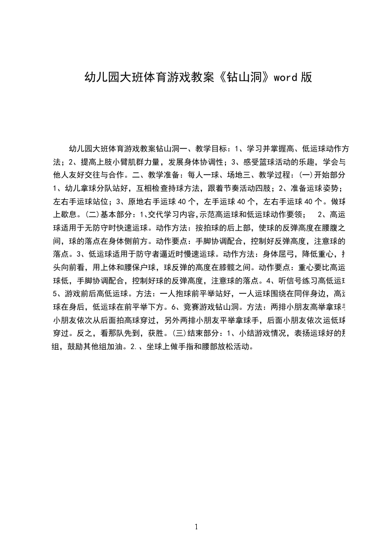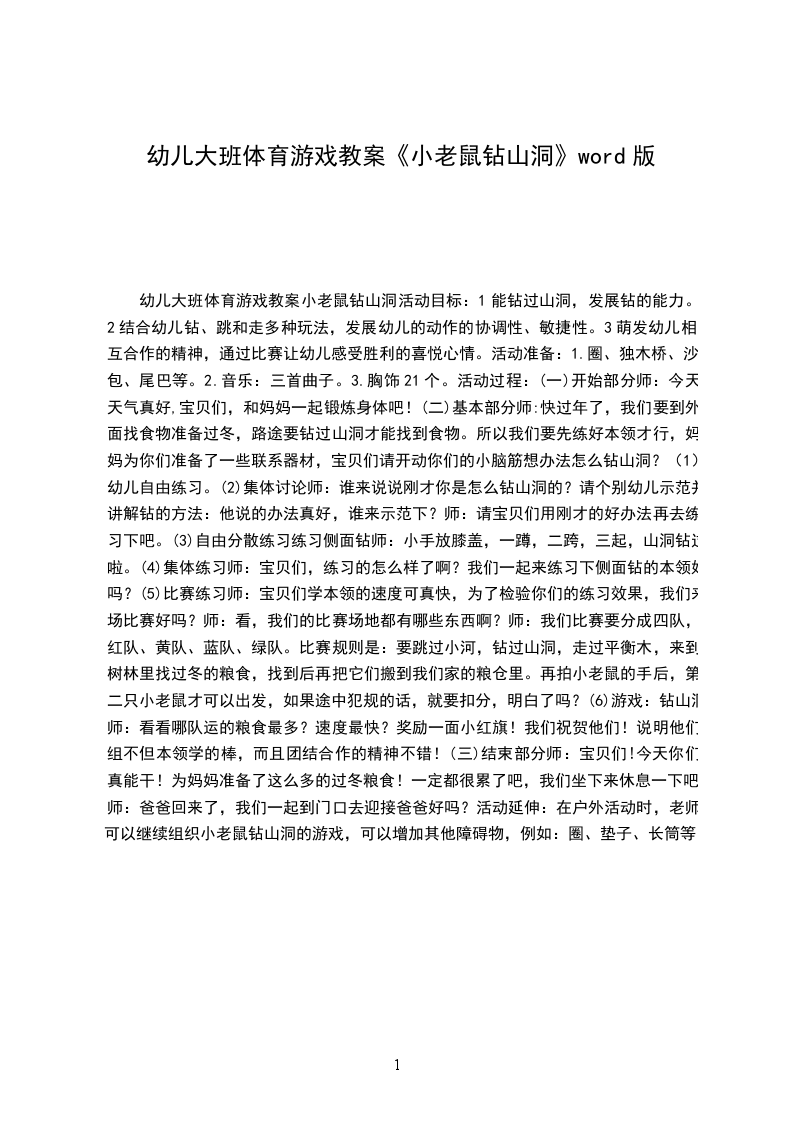 幼儿大班体育游戏教案小老鼠钻山洞活动目标:1能钻过山洞,发展钻的能力。2结合幼儿钻、跳和走多种玩法,发展幼儿的动作的协调性、敏捷性。3萌发幼儿相互合作的精神,通过比赛让幼儿感受胜利的喜悦心情。活动准备: