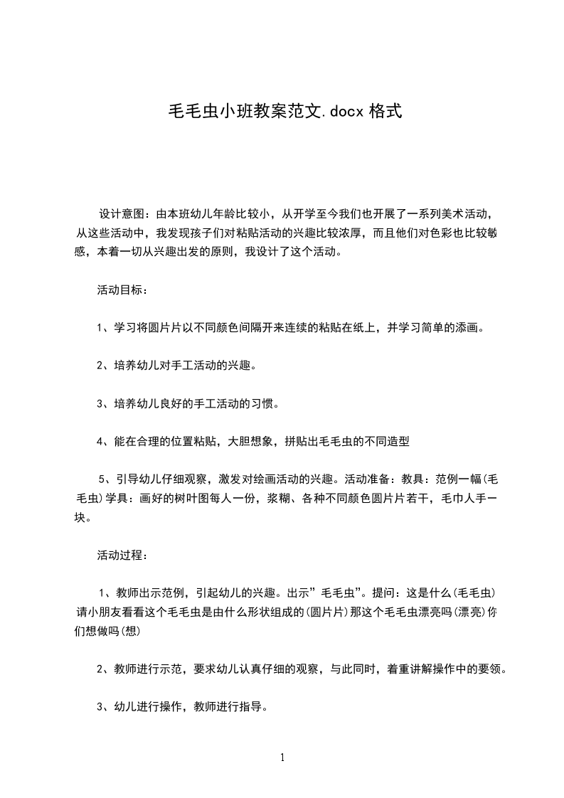 1、活动教具、毛毛虫指偶、毛毛虫头饰、音乐磁带、录音机