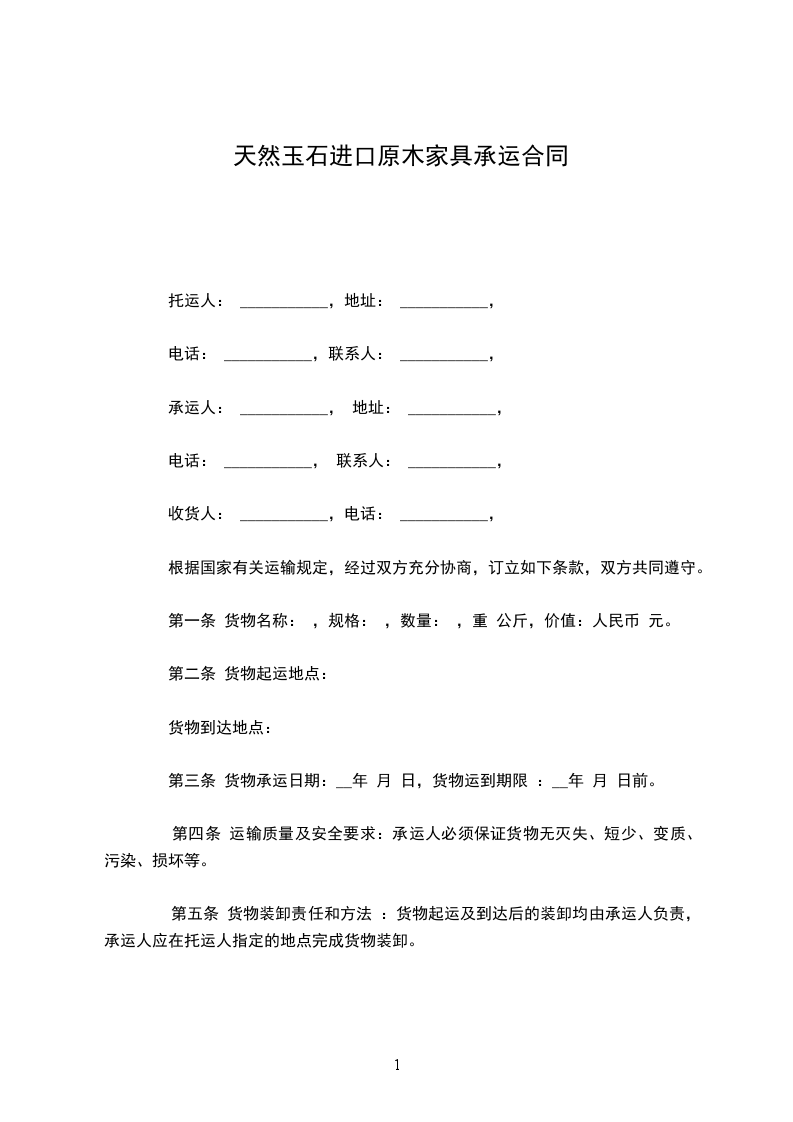 第一条 货物名称: ,规格: ,数量: ,重 公斤,价值:人民币 元。