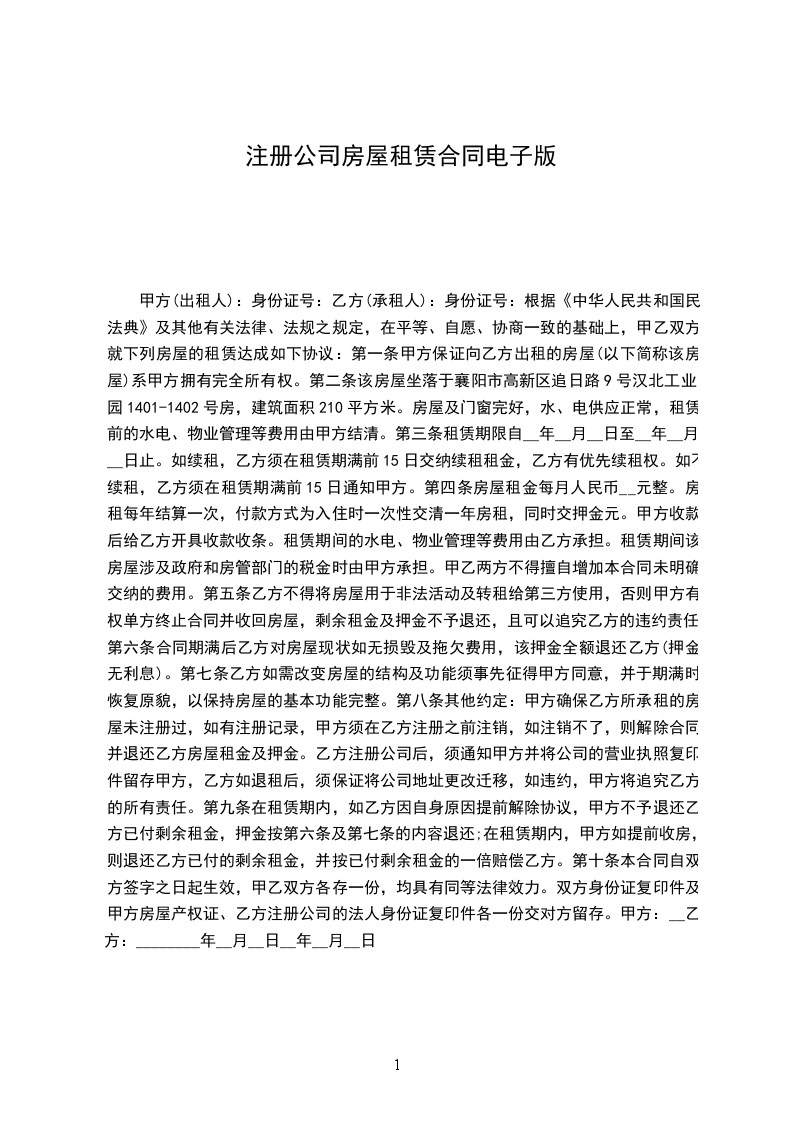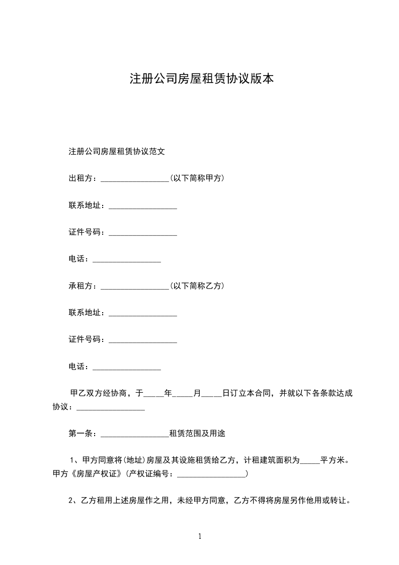 公司注册房屋租赁合同甲方:_乙方:_日期:_公司注册房屋租赁合同甲方:_乙方:_