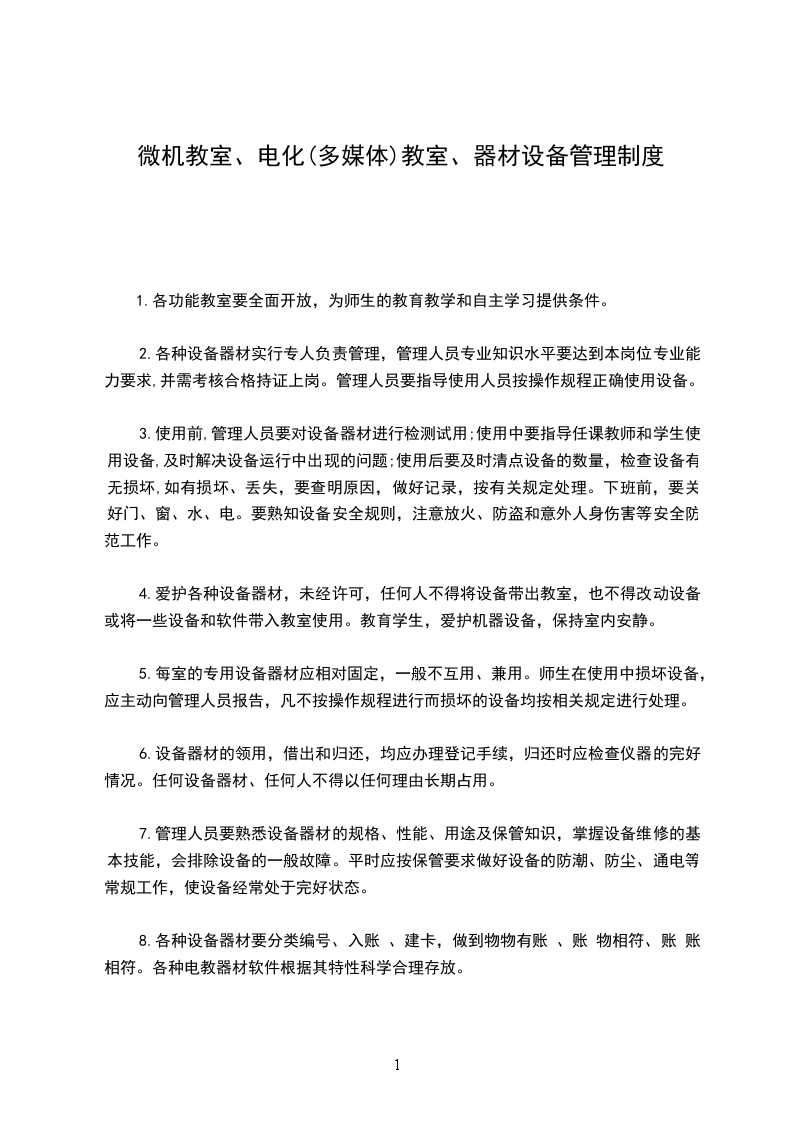 一、计算机室管理人员须爱护室内的设备设施,为保证信息技术教学工作的正常运作,对设备设施要定期除尘、驱潮、检查、保养、维修、升级,定时打开门窗通气,保持室内空气清新。每使用完毕,对设备设施要及时检查,提高教学设备的完好率。