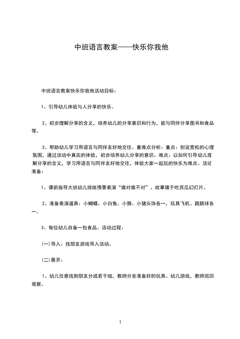 3、帮助幼儿学习用语言与同伴友好地交往。重难点分析:重点:创设宽松的心理氛围,通过活动中真实的体验,初步培养幼儿分享的意识。难点:以如何引导幼儿理解分享的含义,学习用语言与同伴友好地交往,体验大家一起玩的快乐为难点。活动准备: