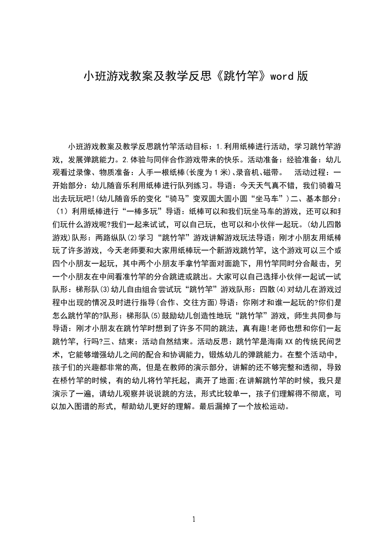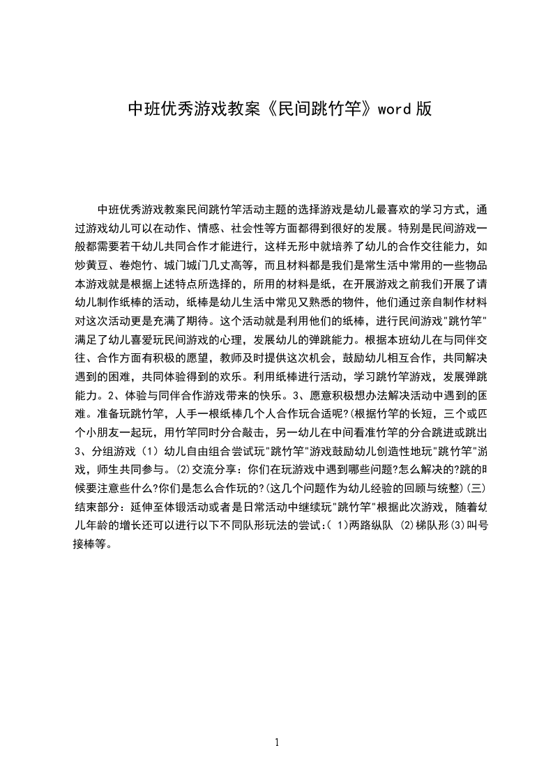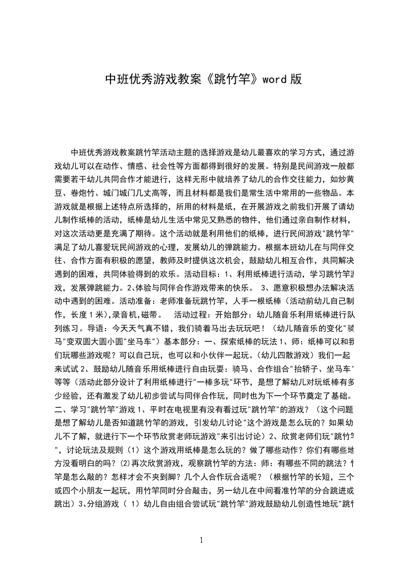 中班优秀游戏教案民间跳竹竿活动主题的选择游戏是幼儿最喜欢的学习方式,通过游戏幼儿可以在动作、情感、社会性等方面都得到很好的发展。特别是民间游戏一般都需要若干幼儿共同合作才能进行,这样无形中就培养了幼儿的合作交往能力,如炒黄豆、卷炮竹、城门城门几丈高等,而且材料都是我们是常生活中常用的一些物品。本游戏就是根据上述特点所选择的,所用的材料是纸,在开展游戏之前我们开展了请幼儿制作纸棒的活动,纸棒是幼儿生活中常见又熟悉的物件,他们通过亲自制作材料,对这次活动更是充满了期待。这个活动就是利用他们的纸棒,进行民间游戏"跳竹竿"满足了幼儿喜爱玩民间游戏的心理,发展幼儿的弹跳能力。根据本班幼儿在与同伴交往、合作方面有积极的愿望,教师及时提供这次机会,鼓励幼儿相互合作,共同解决遇到的困难,共同体验得到的欢乐。利用纸棒进行活动,学习跳竹竿游戏,发展弹跳能力。