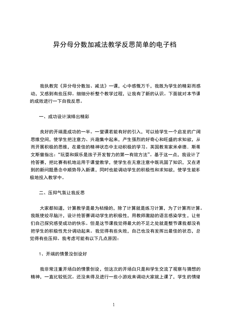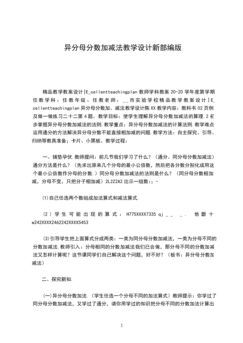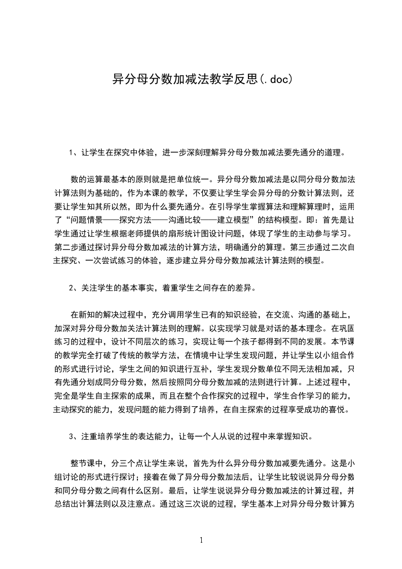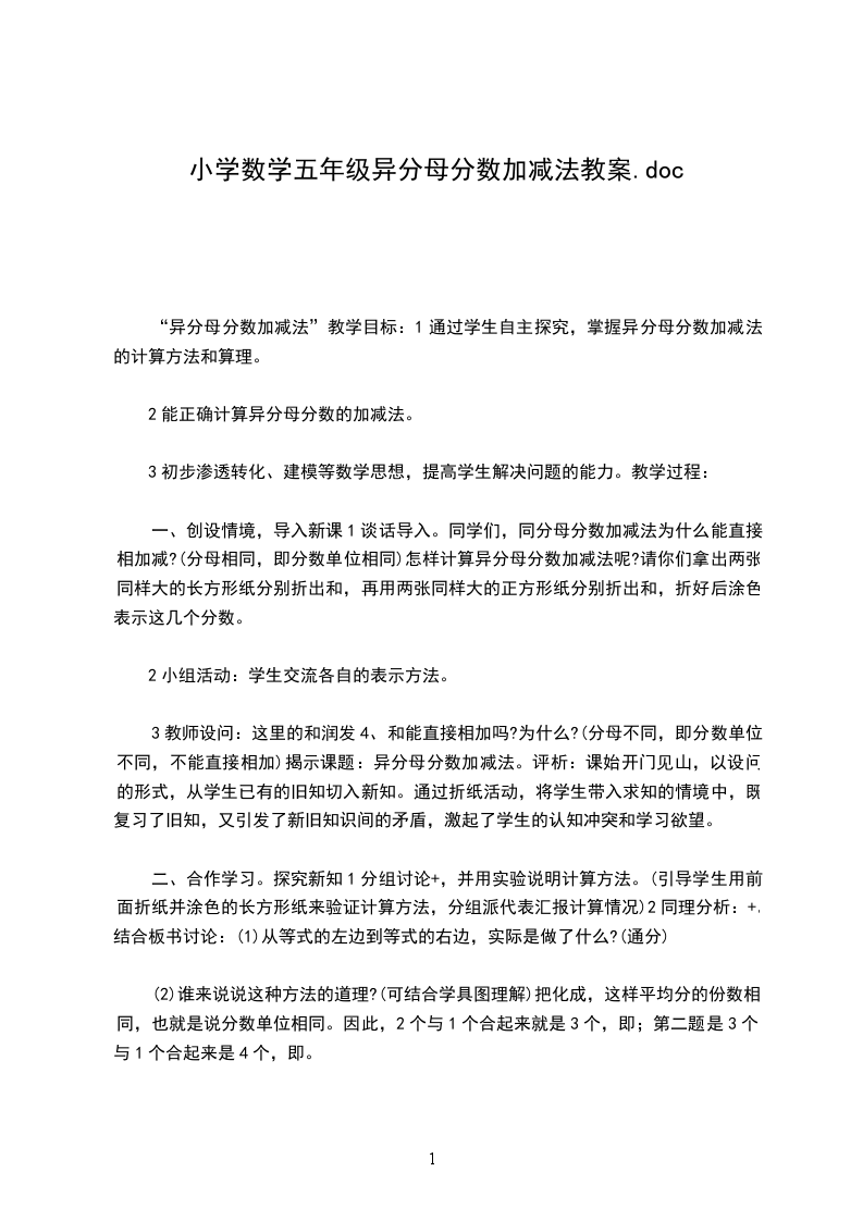 1、知识与技能目标:掌握异分母分数加减法的计算方法,能比较熟练计算异分母分数的加减运算。