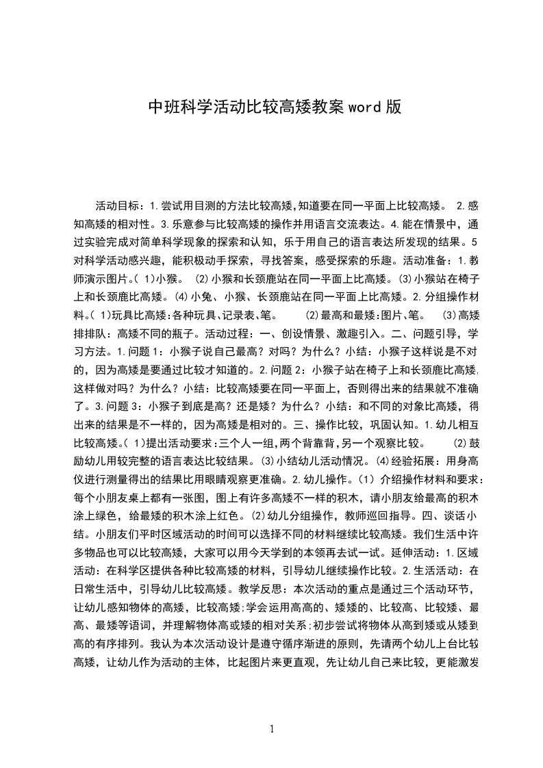2.生活活动:在日常生活中,引导幼儿比较高矮。教学反思:本次活动的重点是通过三个活动环节,让幼儿感知物体的高矮,比较高矮;学会运用高高的、矮矮的、比较高、比较矮、最高、最矮等语词,并理解物体高或矮的相对关系;初步尝试将物体从高到矮或从矮到高的有序排列。我认为本次活动设计是遵守循序渐进的原则,先请两个幼儿上台比较高矮,让幼儿作为活动的主体,比起图片来更直观,先让幼儿自己来比较,更能激发幼儿的学习兴趣,再来观察图片比较高矮,最后进行排序。幼儿学起来是层层递进的,对高矮概念掌握的较好,完成原先设立的目标。