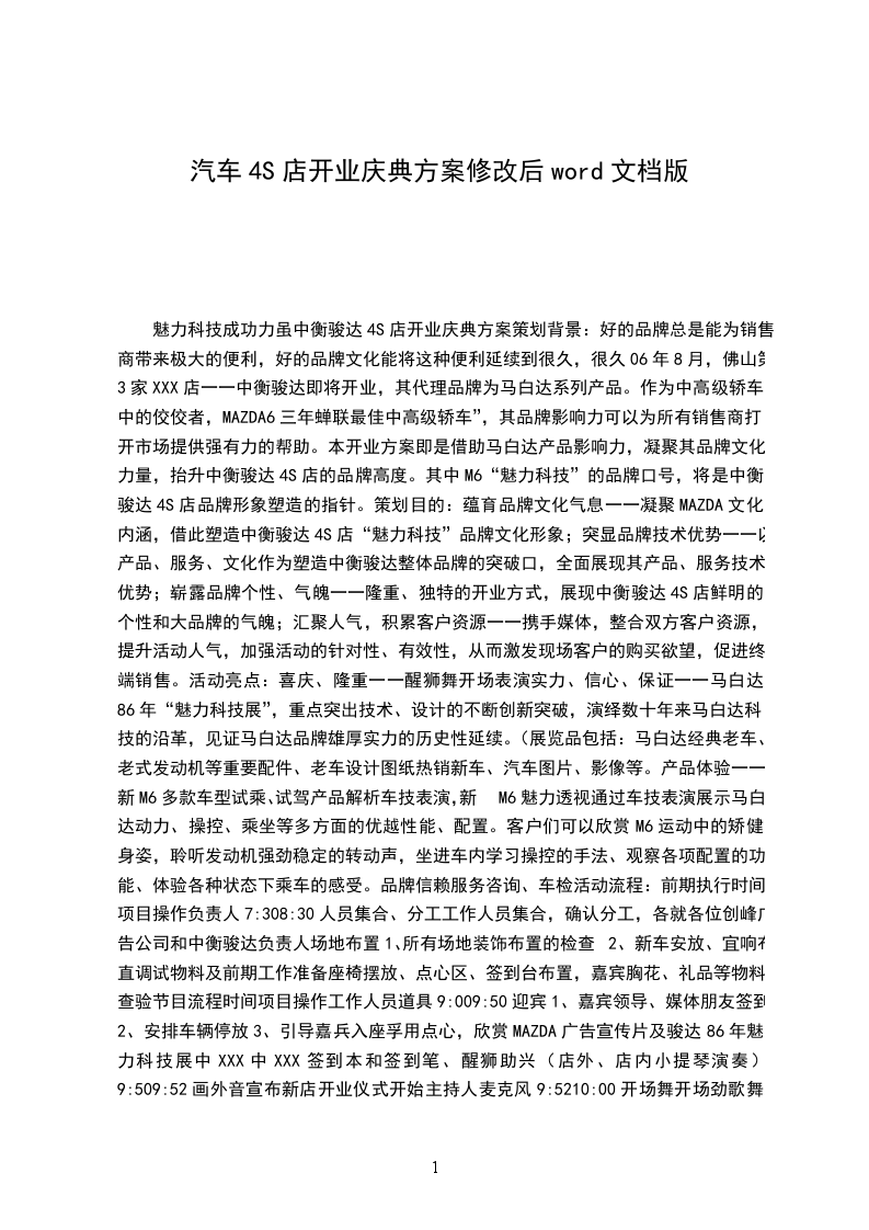 魅力科技成功力虽中衡骏达4S店开业庆典方案策划背景:好的品牌总是能为销售商带来极大的便利,好的品牌文化能将这种便利延续到很久,很久06年8月,佛山第3家XXX店一一中衡骏达即将开业,其代理品牌为马白达系列产品。作为中高级轿车中的佼佼者,MAZDA6三年蝉联最佳中高级轿车”,其品牌影响力可以为所有销售商打开市场提供强有力的帮助。本开业方案即是借助马白达产品影响力,凝聚其品牌文化力量,抬升中衡骏达4S店的品牌高度。其中M6“魅力科技”的品牌口号,将是中衡骏达4S店品牌形象塑造的指针。策划目的:蕴育品牌文化气息一一凝聚MAZDA文化内涵,借此塑造中衡骏达4S店“魅力科技”品牌文化形象;突显品牌技术优势一一以产品、服务、文化作为塑造中衡骏达整体品牌的突破口,全面展现其产品、服务技术优势;崭露品牌个性、气魄一一隆重、独特的开业方式,展现中衡骏达4S店鲜明的个性和大品牌的气魄;汇聚人气,积累客户资源一一携手媒体,整合双方客户资源,提升活动人气,加强活动的针对性、有效性,从而激发现场客户的购买欲望,促进终端销售。活动亮点:喜庆、隆重一一醒狮舞开场表演实力、信心、保证一一马白达86年“魅力科技展”,重点突出技术、设计的不断创新突破,演绎数十年来马白达科技的沿革,见证马白达品牌雄厚实力的历史性延续。(展览品包括:马白达经典老车、老式发动机等重要配件、老车设计图纸热销新车、汽车图片、影像等。产品体验一一新M6多款车型试乘、试驾产品解析车技表演,新M6魅力透视通过车技表演展示马白达动力、操控、乘坐等多方面的优越性能、配置。客户们可以欣赏M6运动中的矫健身姿,聆听发动机强劲稳定的转动声,坐进车内学习操控的手法、观察各项配置的功能、体验各种状态下乘车的感受。品牌信赖服务咨询、车检活动流程:前期执行时间项目操作负责人7:308:30人员集合、分工工作人员集合,确认分工,各就各位创峰广告公司和中衡骏达负责人场地布置