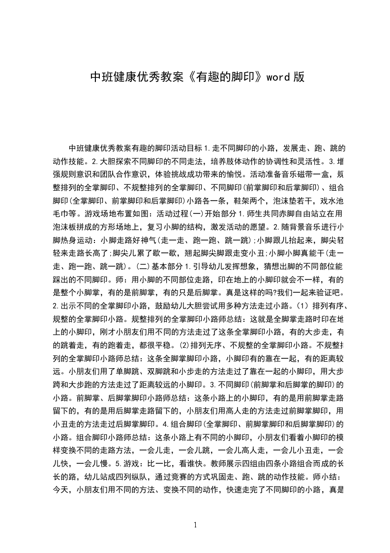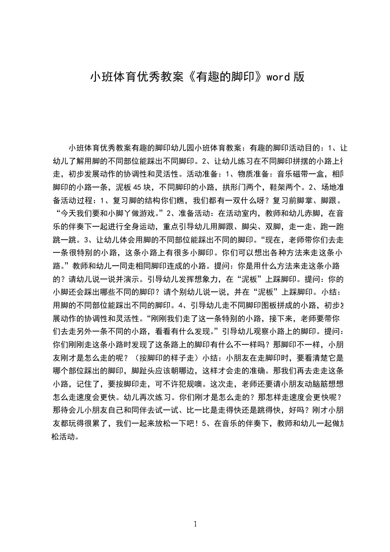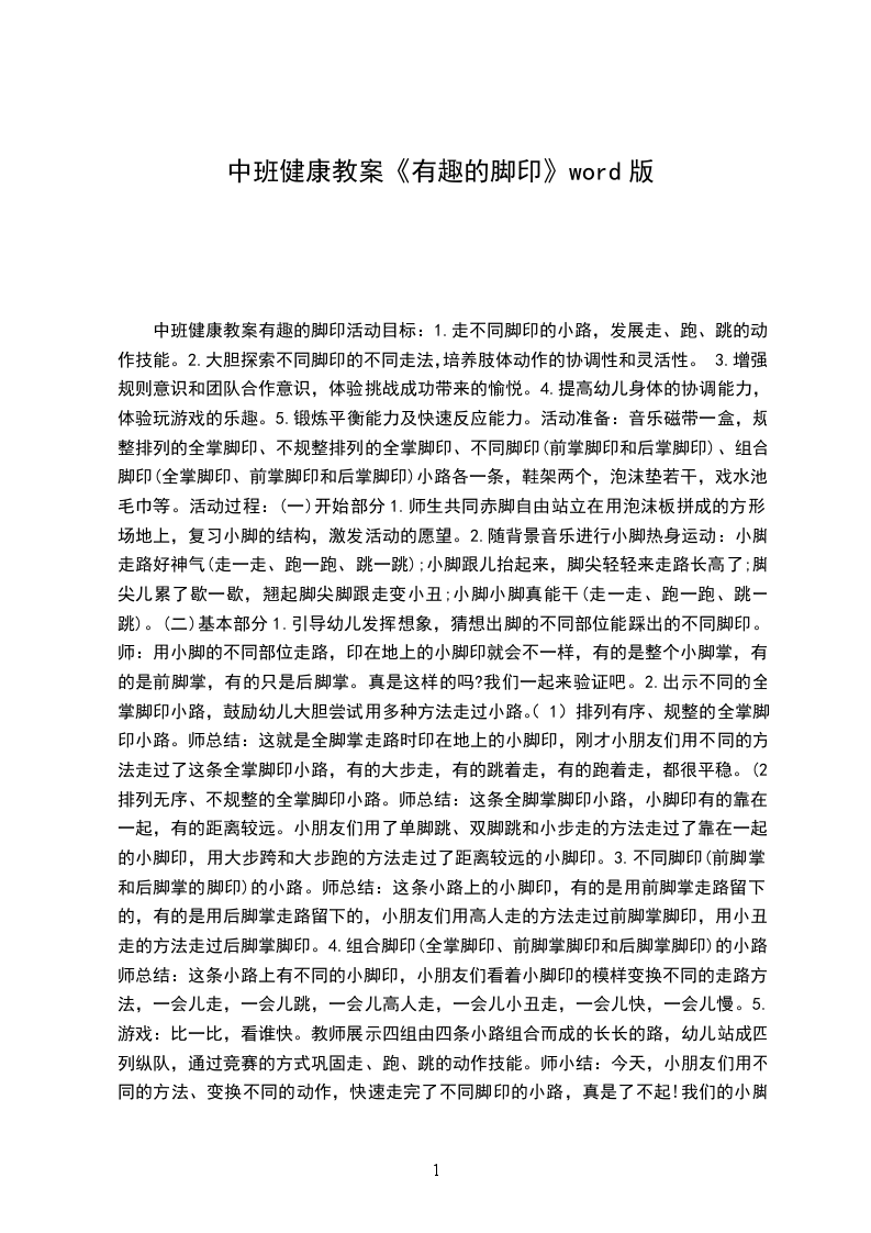 2、让幼儿练习在不同脚印拼摆的小路上行走,初步发展动作的协调性和灵活性。活动准备: