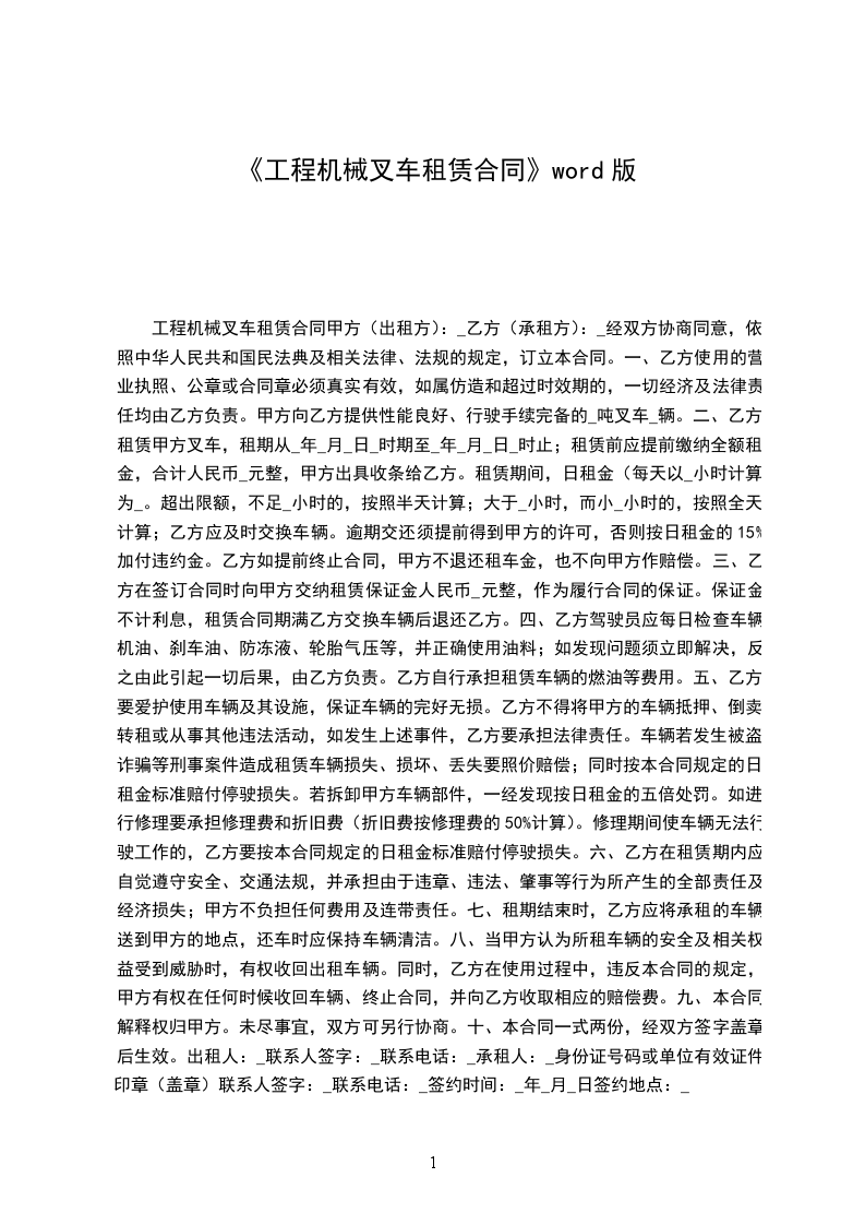 工程机械叉车租赁合同甲方(出租方):_乙方(承租方):_经双方协商同意,依照中华人民共和国民法典及相关法律、法规的规定,订立本合同。
