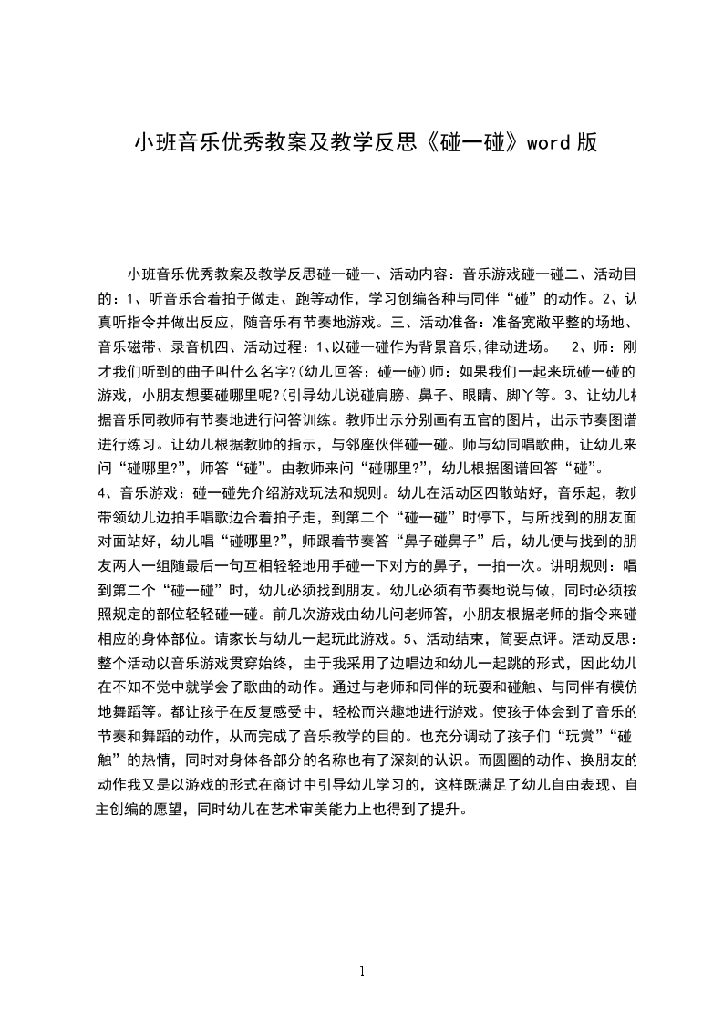 3、结束部分:听着音乐跳出去。附歌曲:1C554332||565|找呀找呀找朋友5432|131||找到朋友碰一碰。碰哪里?碰碰手。活动反思:现在的孩子大多是独生子女,刚入园时,他们不仅和同龄的孩子一样有一定的自我中心倾向,还在社会交往方面表现出一些缺憾,如退缩、拒绝、远离等,与同伴之间还没有达成很好的沟通。为此,我选择了了碰一碰这个音乐活动设计相关教案,组织教学。碰一碰这首歌曲表达了朋友与朋友之间相互接触,相互友好的情感,歌词浅显易懂,歌曲简单学唱。孩子们可以通过对唱词进行动作的演绎,体验与同伴碰头、碰肩、碰手的欢乐,初步培育幼儿的社会交往能力,使其身心健康的发展。现在正值小班开学初,孩子们与同伴的交往经验不足,因而,在组织教学活动中,我将该活动分成两课时完成。这节教学活动主要是学唱歌曲,理解“碰”动作,通过参与音乐游玩,培育初步的合作意识。为了更好的让孩子理解“碰”动作,我将原歌词做了适当的调整,将“鼻子碰鼻子”改成小手碰肩膀,让孩子们切身体验“碰”动作的含义。整节活动有序的组织,孩子们心情积极,课堂氛围轻松,孩子参与活动的欲望剧烈,活动状态活而不乱,教学目标能够较好的完成。发觉的状况有两点:主配班的协作需要加强;孩子们需要具备相关的学问经验,让活动更有效深入地开展。