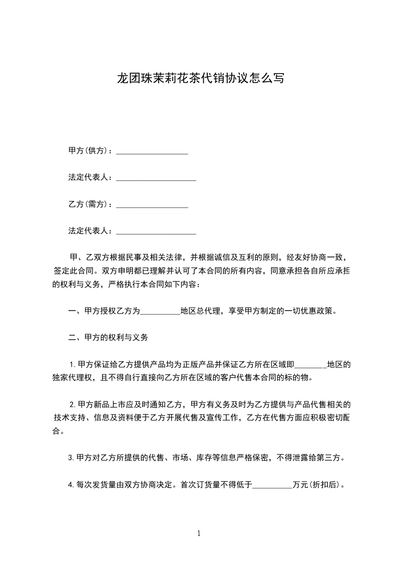 一、甲方授权乙方为__________地区总代理,享受甲方制定的一切优惠政策。