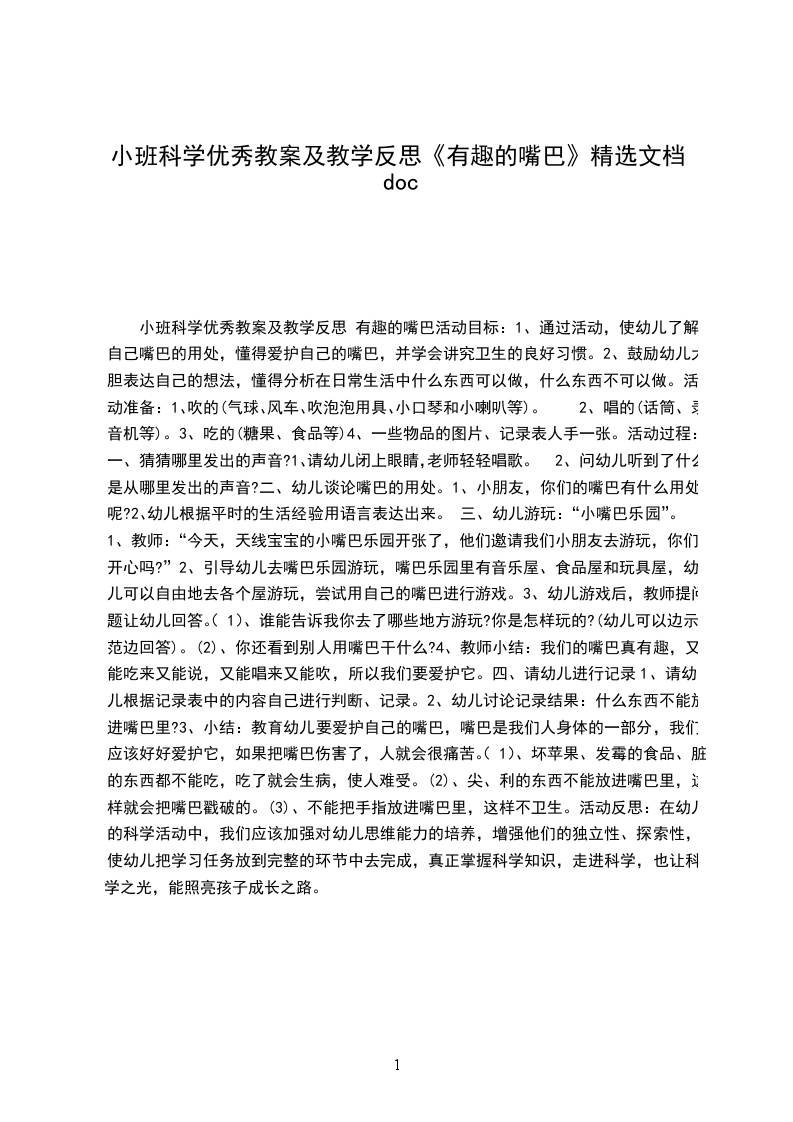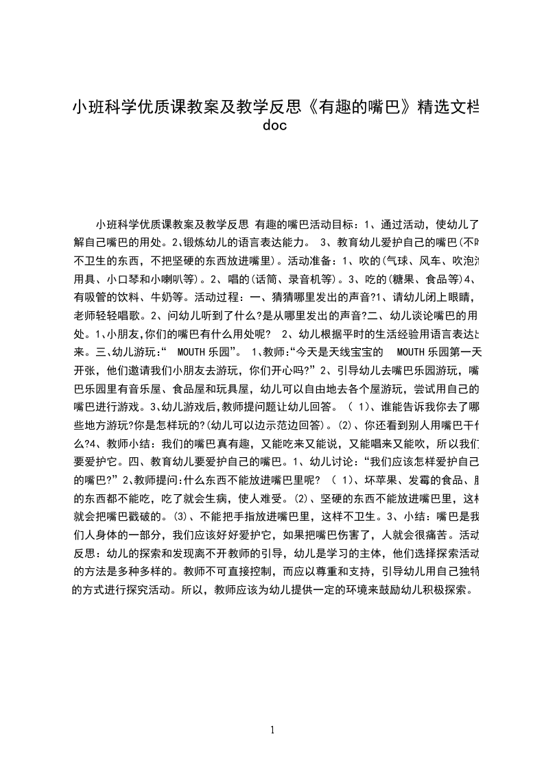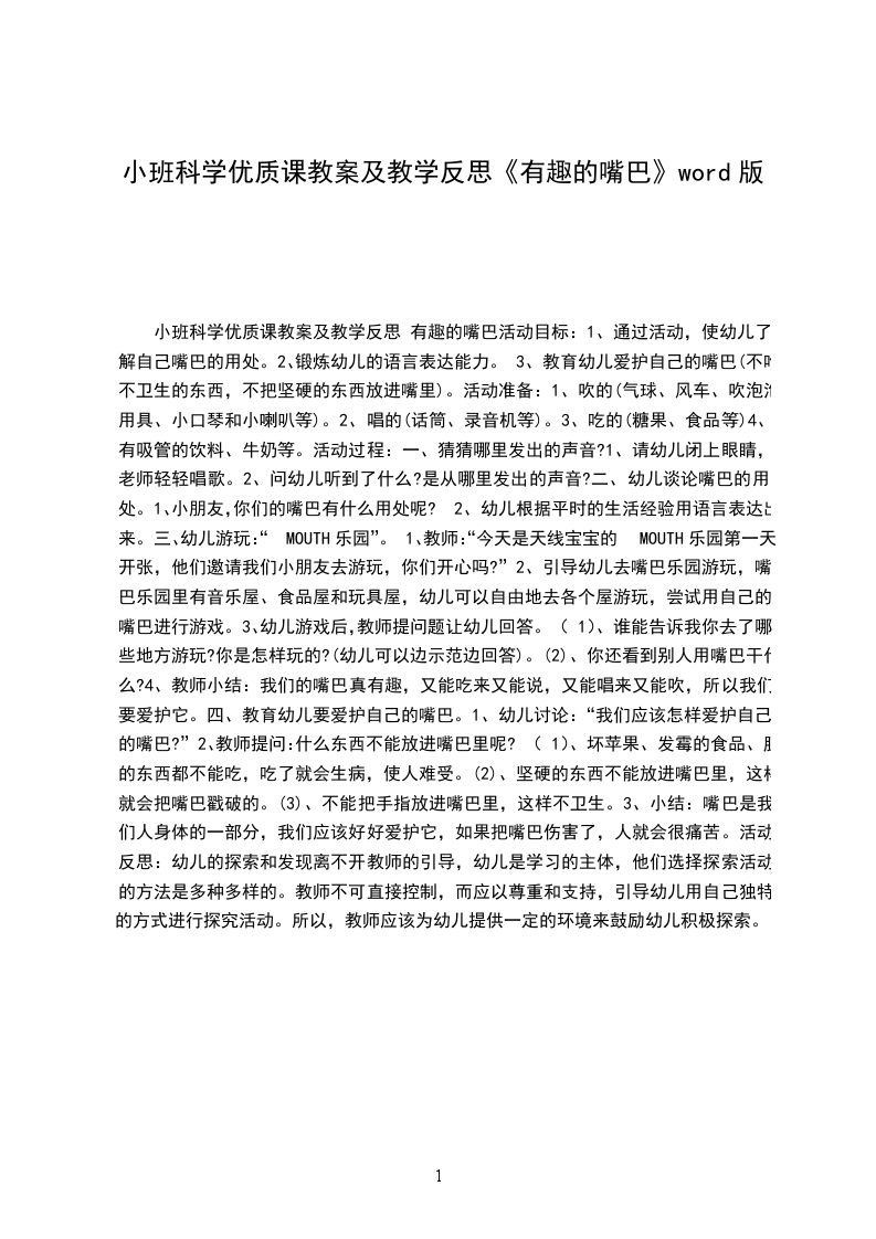 小班科学教案及教学反思 动物的嘴巴活动设计背景小朋友喜欢和小动物一起玩。所以,设计这堂课时,我从幼儿已有的知识出发,培养幼儿积极思考的习惯,激发幼儿探索动物嘴巴特征的欲望。同时,把爱护动物的情感贯穿活动中,让幼儿获取知识的同时,情感也得到熏陶。活动目标