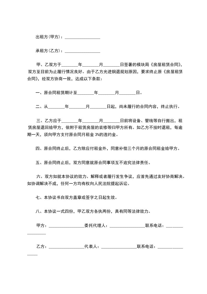 甲、乙双方于________年________月________日签署的模块局《房屋租赁合同》,双方至目前为止履行情况良好。由于乙方光进铜退规划原因,要求终止原《房屋租赁合同》,经双方协商一致,达成以下条款: